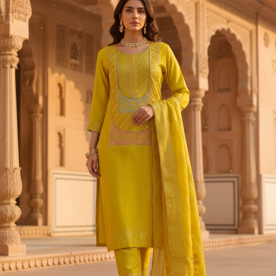 Panna Shine Bright Mango Gold Dolna Readymade Suit Set And Pant With Dolna Dupatta