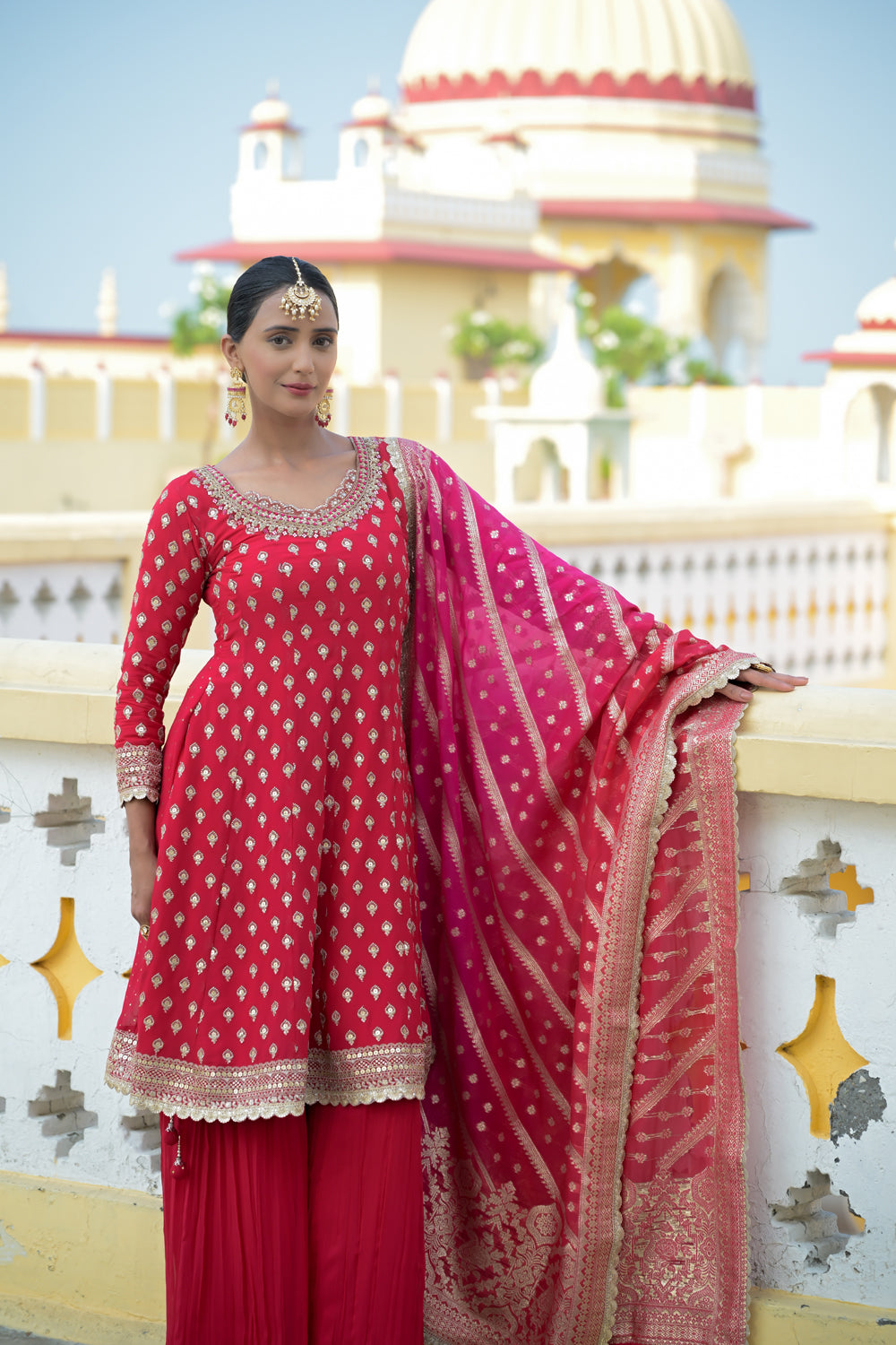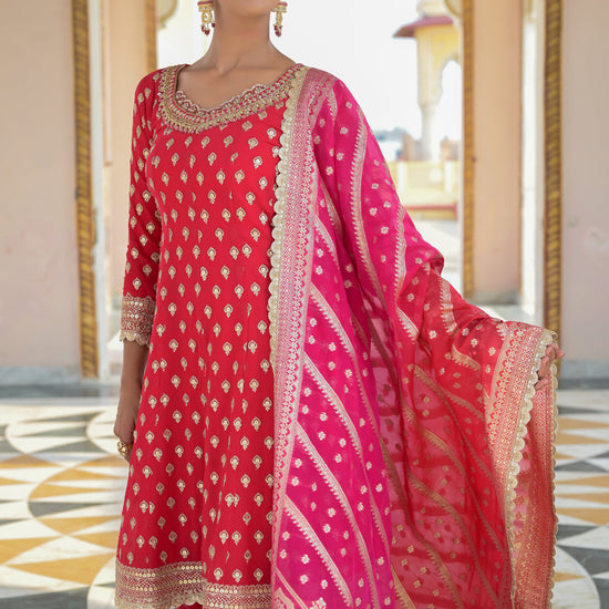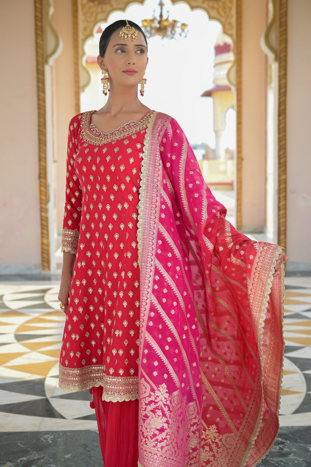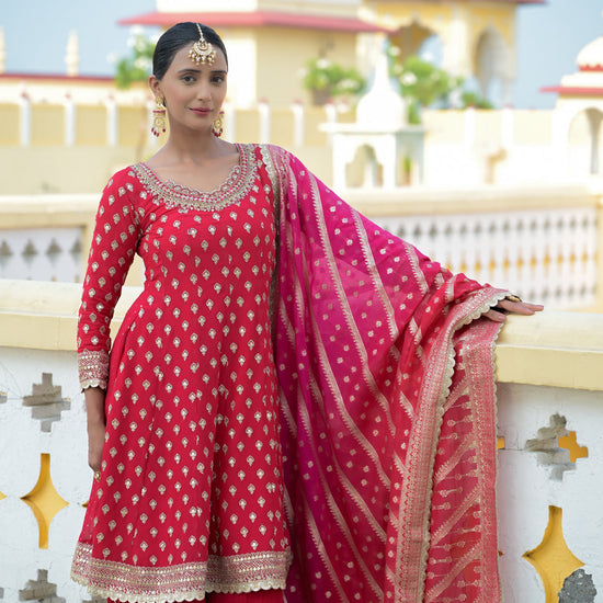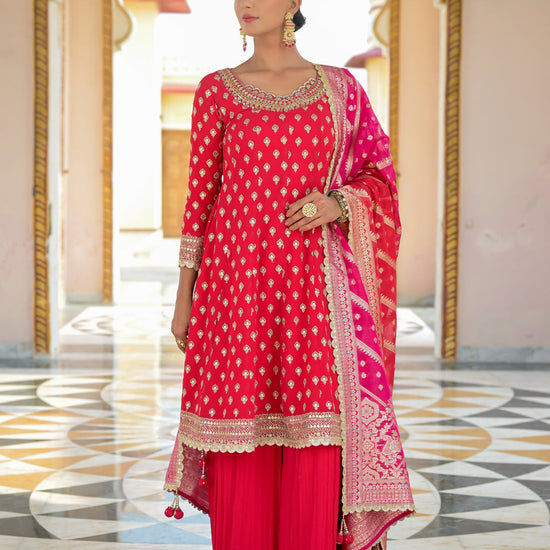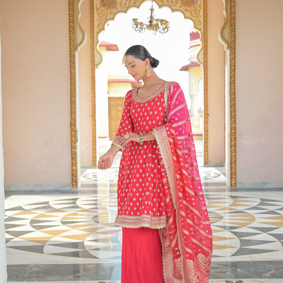 Panna Red Georgette Readymade Sharara Set With Georgette Dupatta