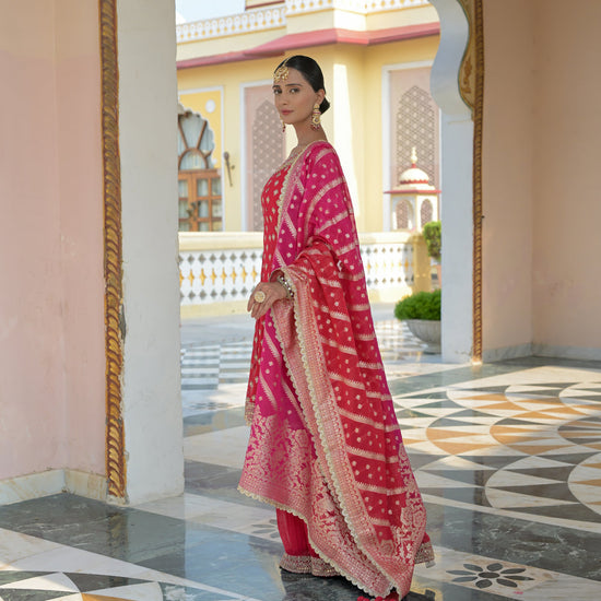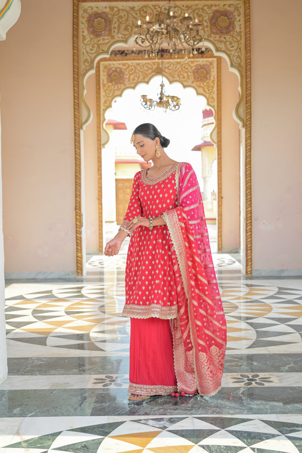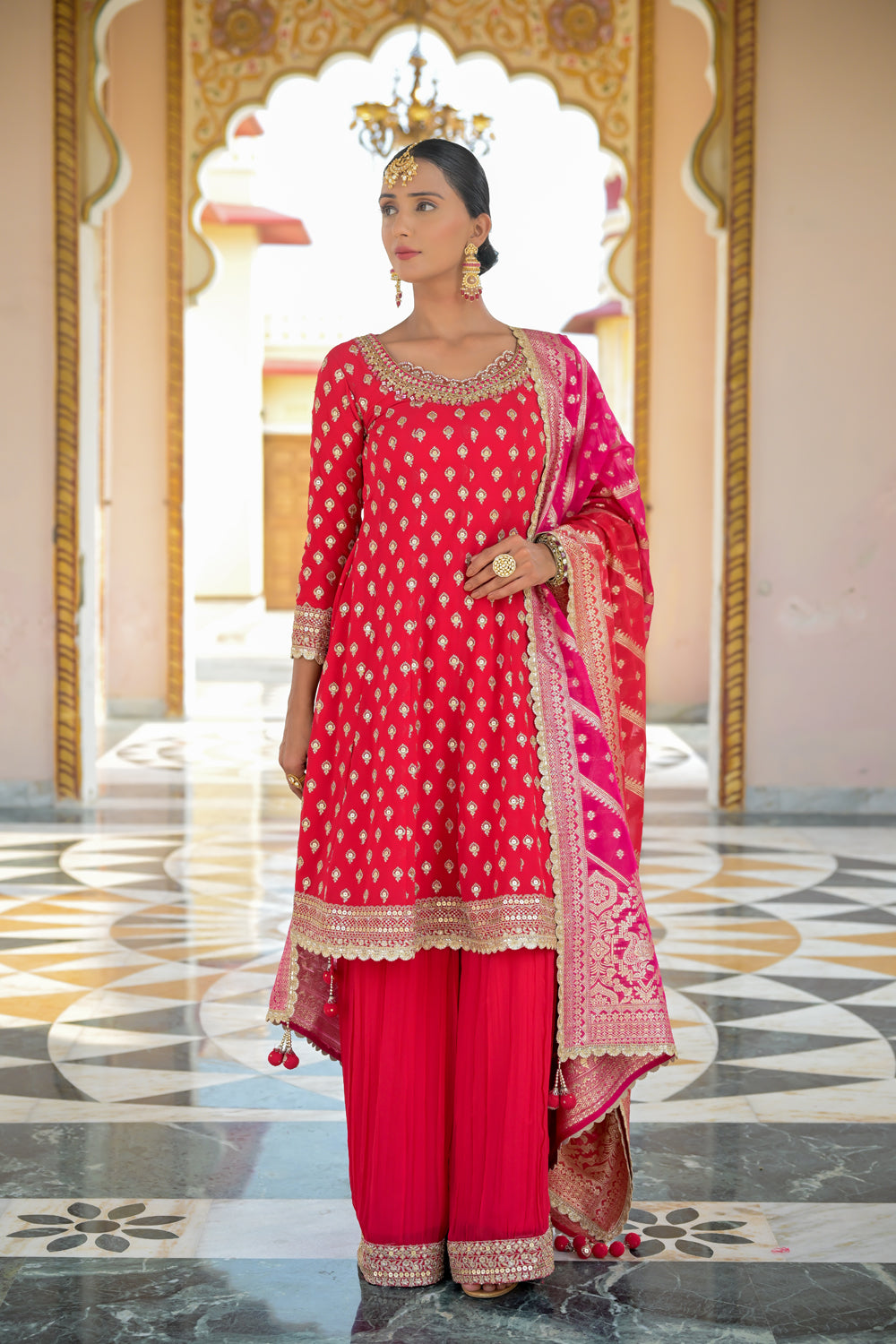Panna Red Georgette Readymade Sharara Set With Georgette Dupatta