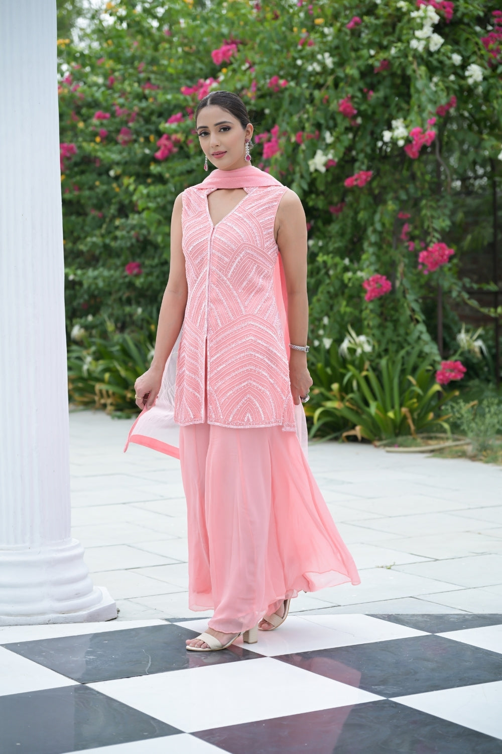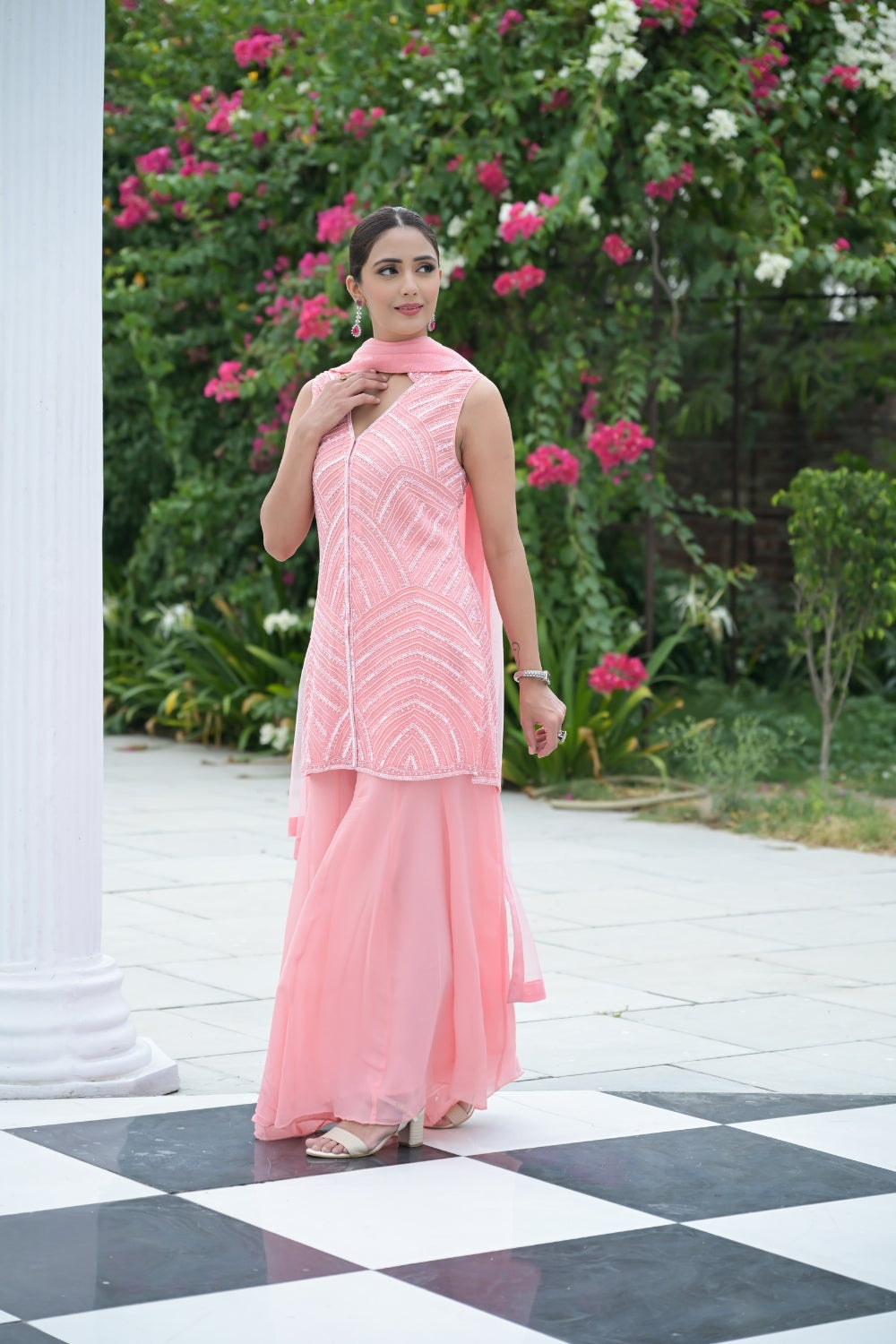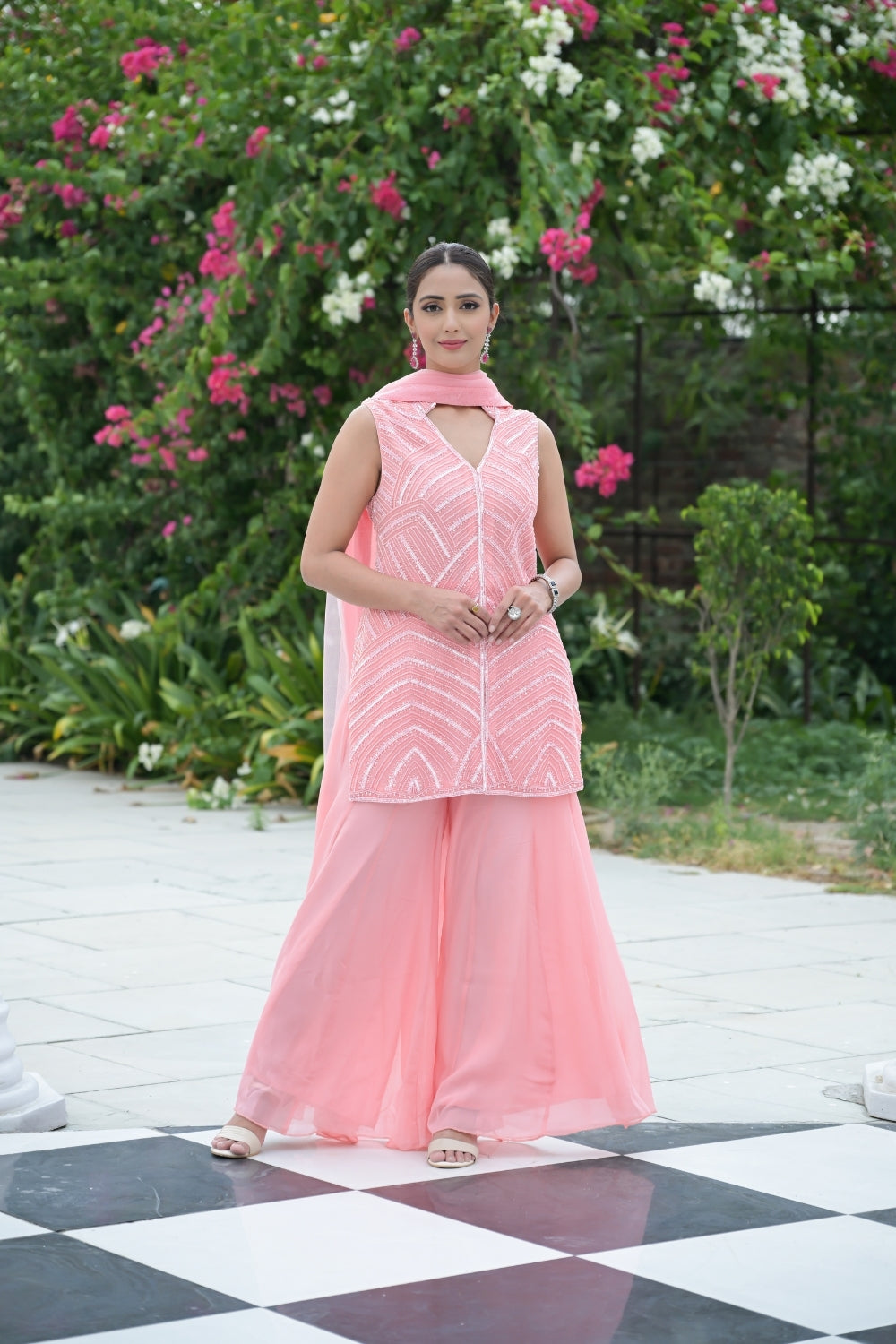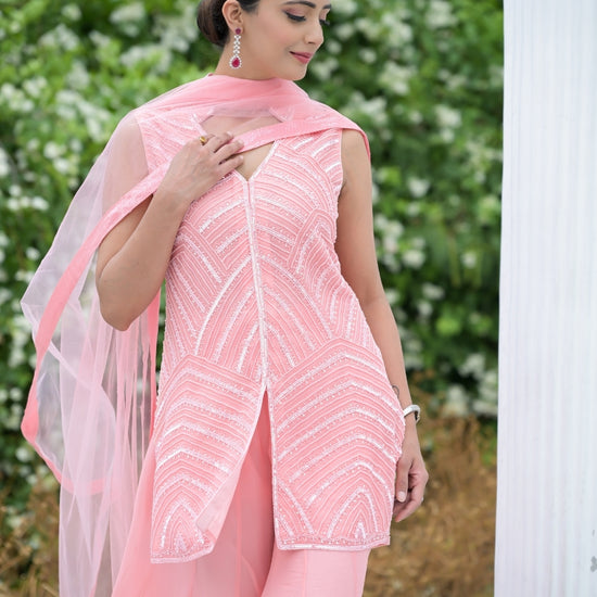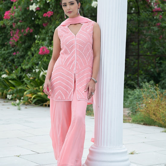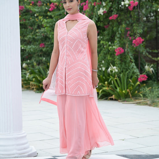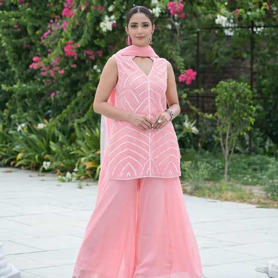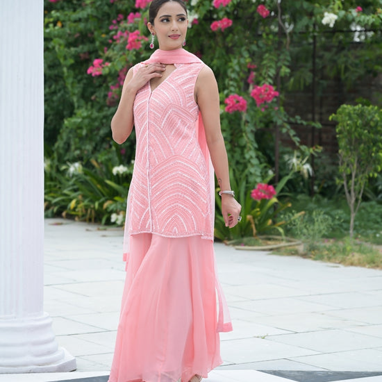 Panna Peach Bead, Sequence & Threadwork Georgette Readymade Sharara Set With Net Dupatta