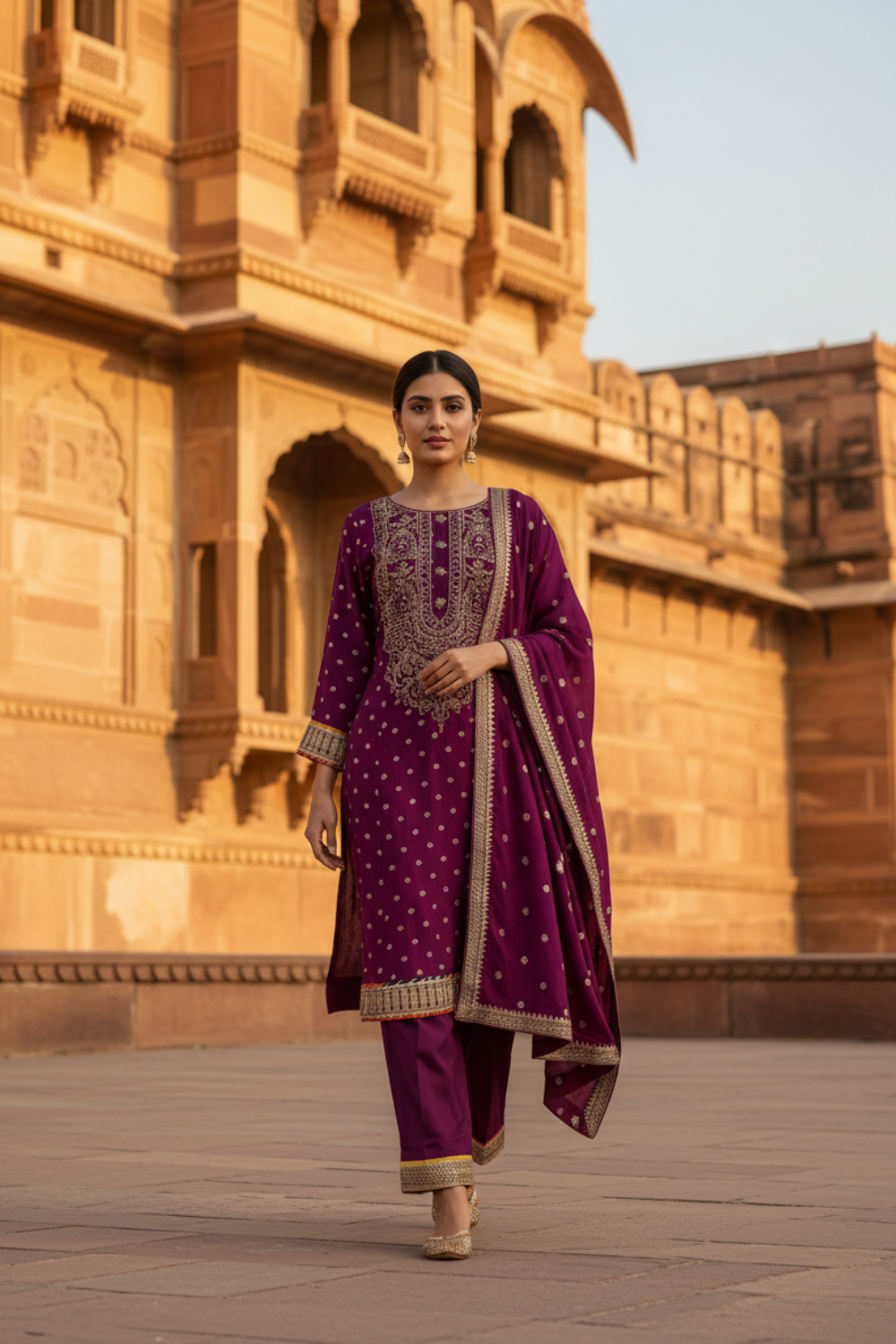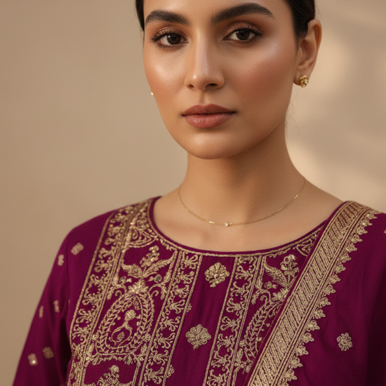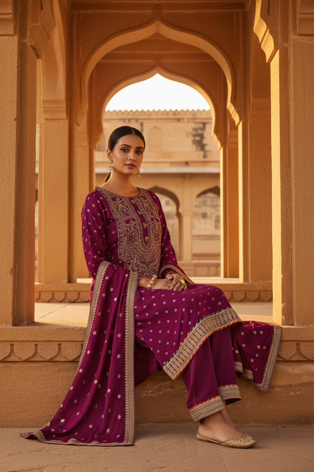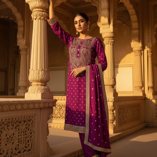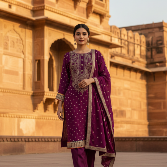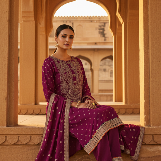 Magenta Dolna Readymade Suit And Palazzo With Banarasi Silk Dupatta – The Panna Shop