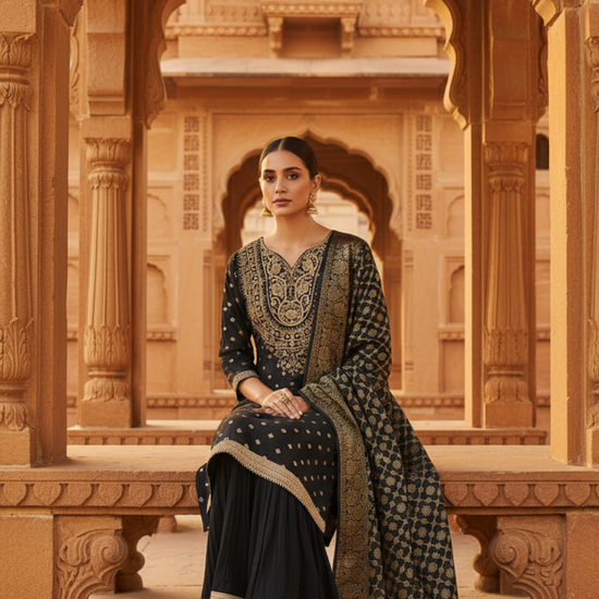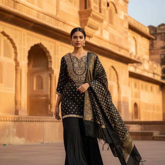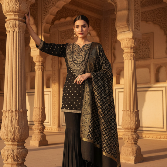 Panna Black Dolna Readymade Sharara Set With Organza Dupatta