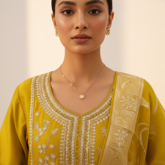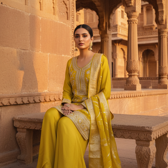 Designed with Sequence & Zari Threadwork, this Satin ready-made suit is perfect for Formal Occasion. Its Lightweight finish ensures effortless elegance. Dry Wash / Dry Clean recommended.