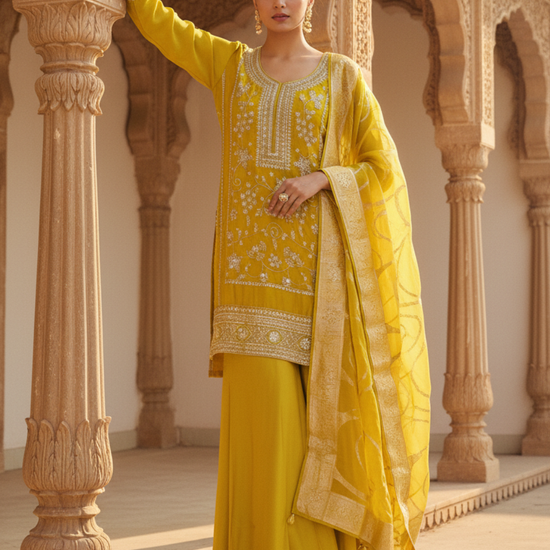 Panna Parrot Satin Readymade Sharara Set With Organza Dupatta