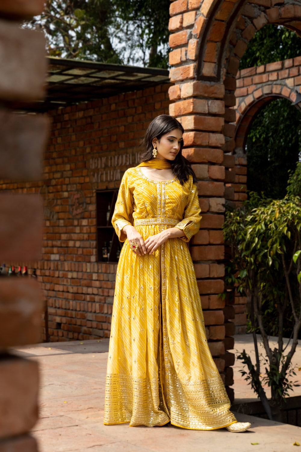 Panna Mango Gold Organza Floor Length Readymade Suit With Chinon Dupatta