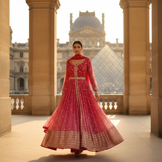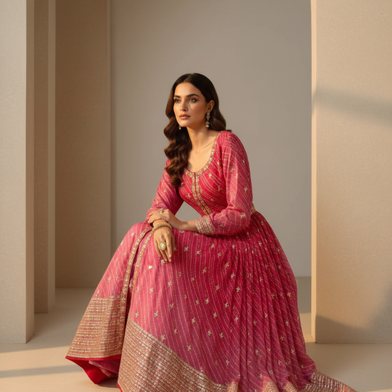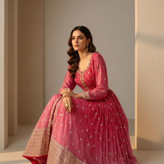 Embrace delicate sophistication with this readymade suit crafted from lightweight, sheer Organza fabric. Featuring a charming Bandhani print, the ensemble exudes traditional elegance with a contemporary touch. Accentuated with Gotta Patti, Mirror work, Sequence work, and intricate Zari Thread embroidery, the suit sparkles with subtle opulence, Its airy texture and graceful drape ensure comfort while highlighting the intricate craftsmanship, making it a must-have for those who cherish timeless style.
