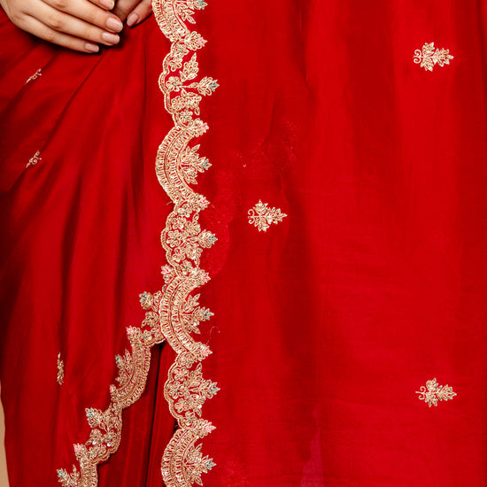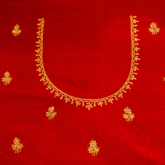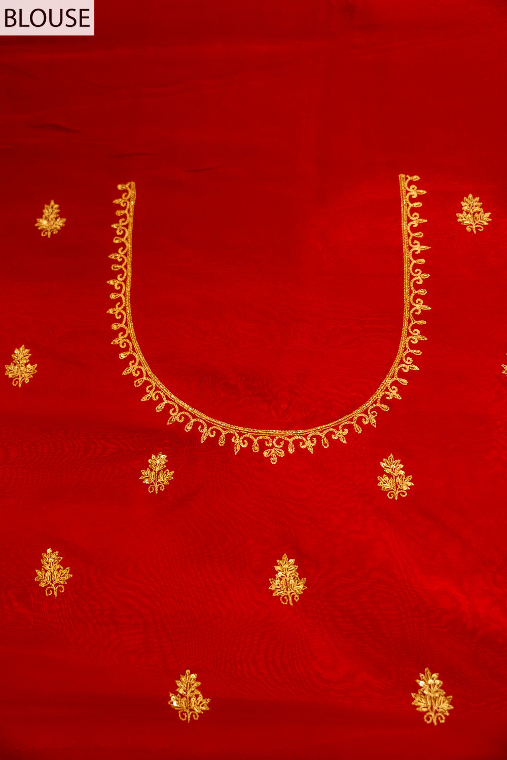 Step into elegance with this luxurious Organza Saree. The saree is heavily adorned with Intricate Golden Zari Embroidery Richly designed pallu is embellished with dense embroidery, making it the highlight of the saree, and regal appeal—perfect for weddings, receptions, engagement parties, cocktail evenings, and festive celebrations.
