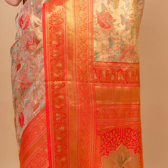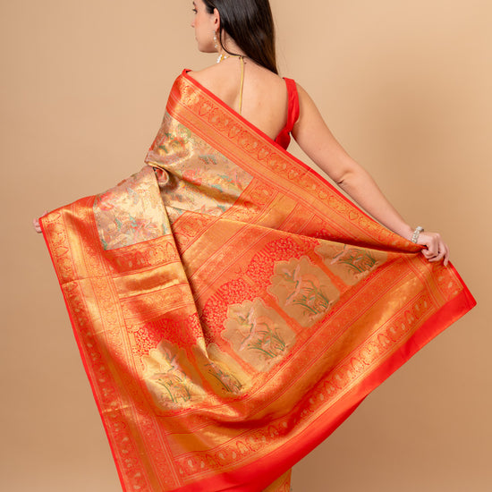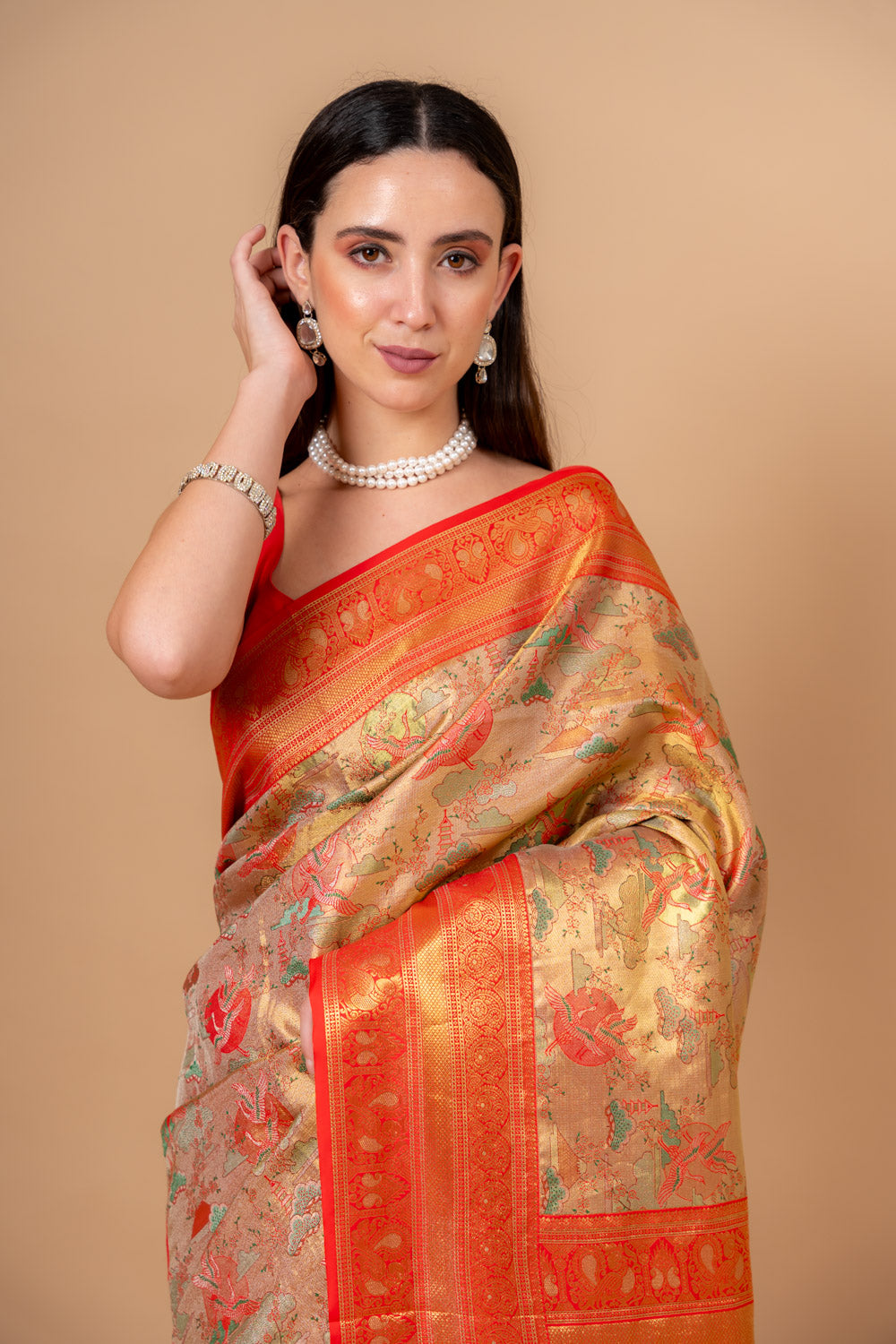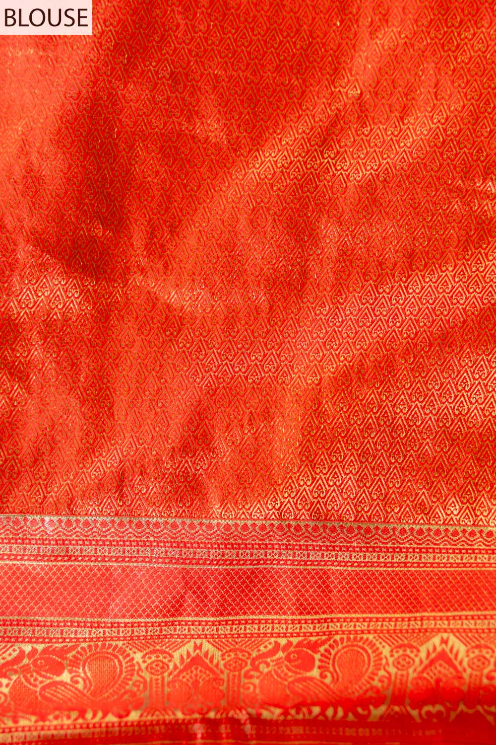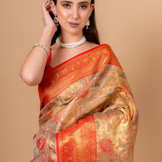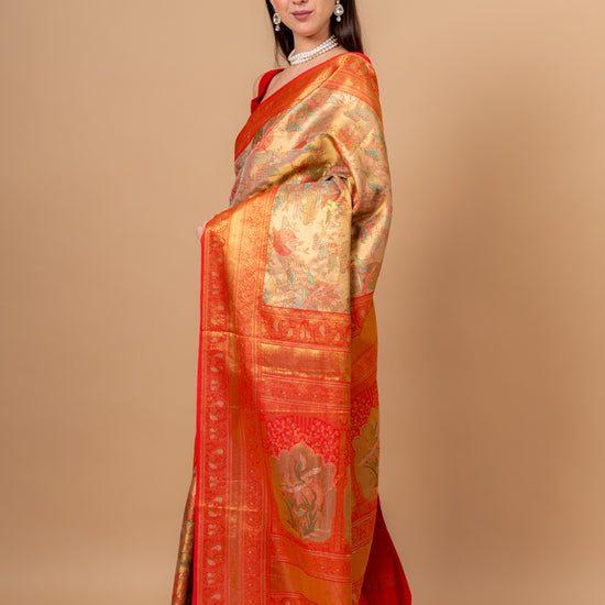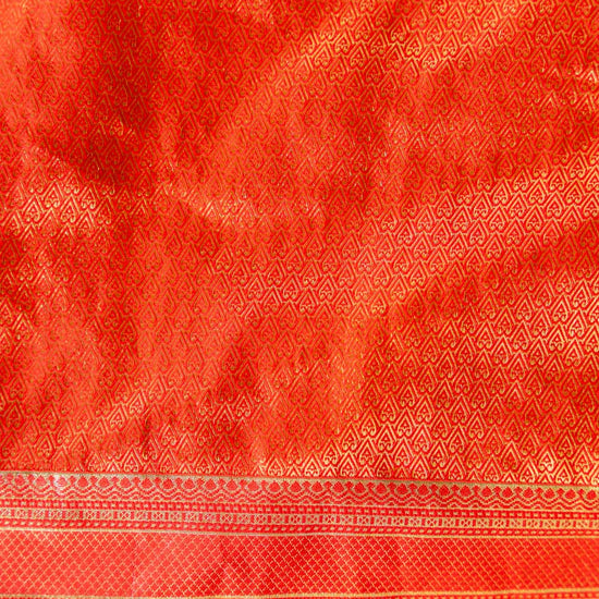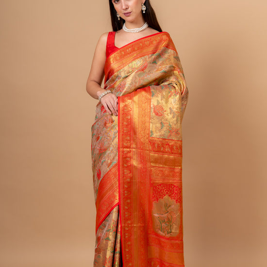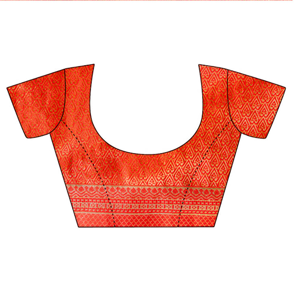 Panna Grace Redefined Red Banarasi Saree With Floral Patterns And Zari Border With Unstitched Blouse