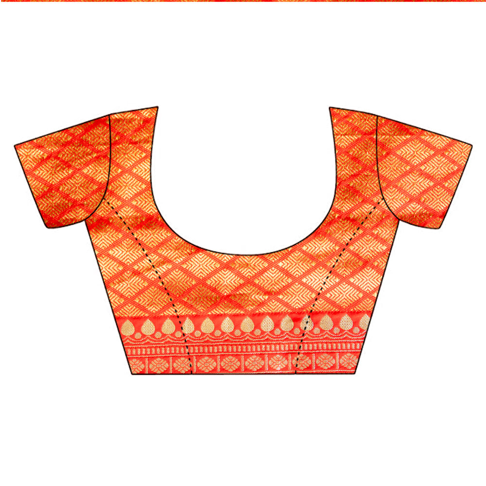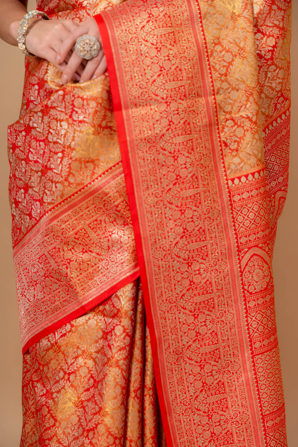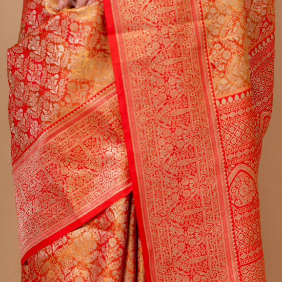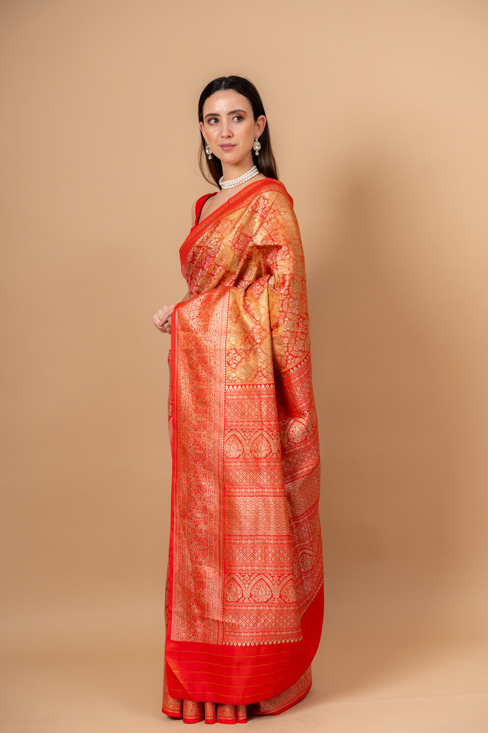 Step into timeless elegance with this dense floral jaal (all-over vine pattern) Banarasi silk saree. Crafted from premium silk, Silver Zari border with traditional designed combination of red, orange, and gold zari pallu , smooth finish, and regal appeal—perfect for festive occasions, weddings, and cultural celebrations.