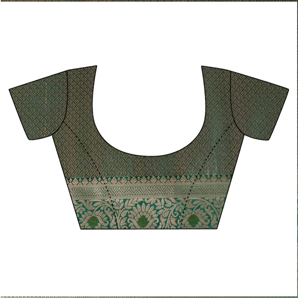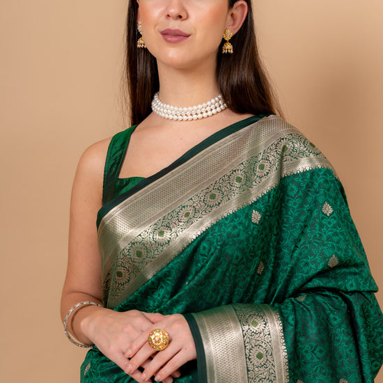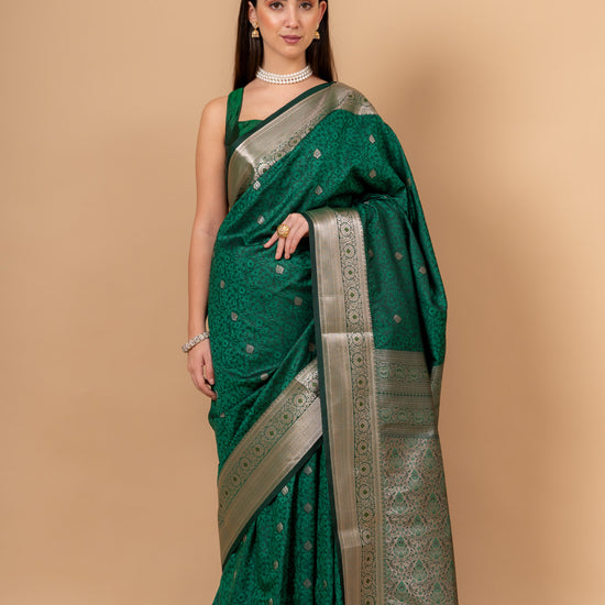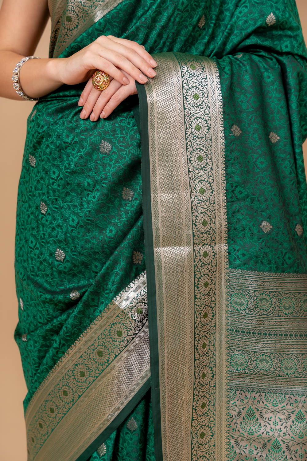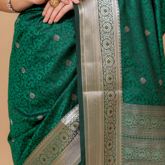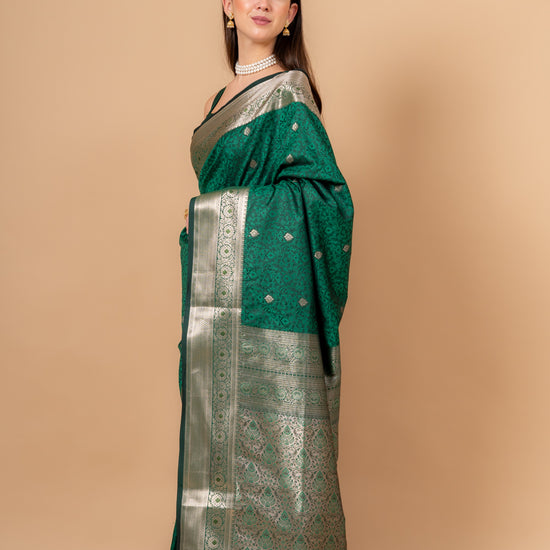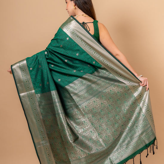 Panna Regal Charm Bottle Green Banarsi Woven Silk Saree With Unstitched Blouse