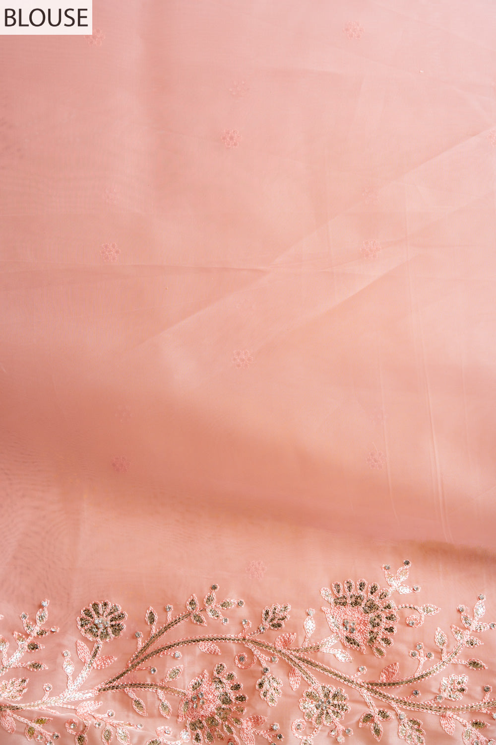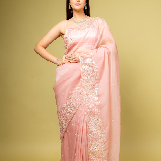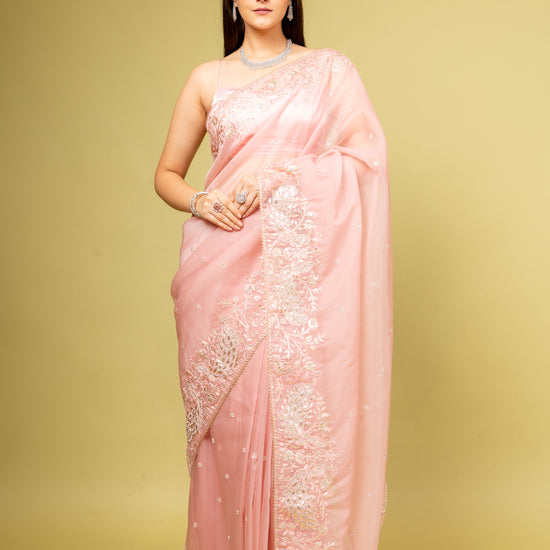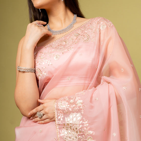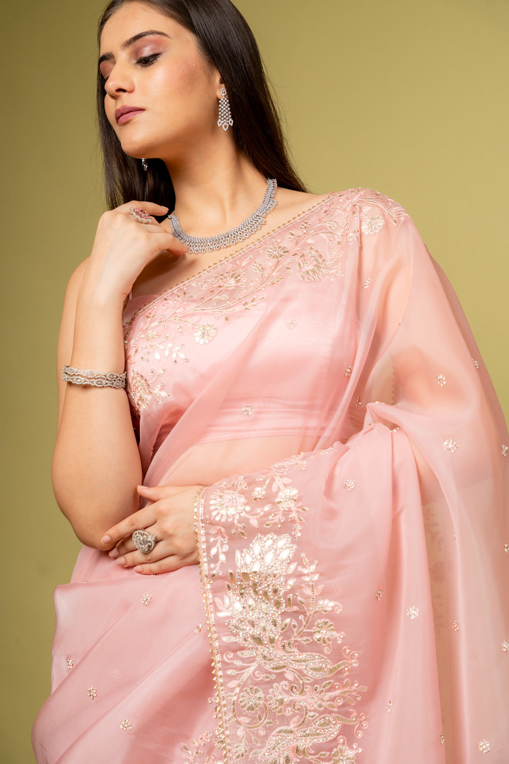 Step into elegance with this luxurious Organza Saree. The saree is heavily adorned with Intricate Silver Zari Embroidery Richly designed pallu is embellished with dense Floral embroidery, making it the highlight of the saree, and regal appeal—perfect for weddings, receptions, engagement parties, cocktail evenings, and festive celebrations.