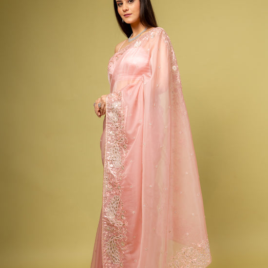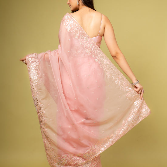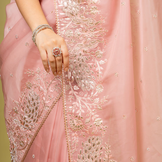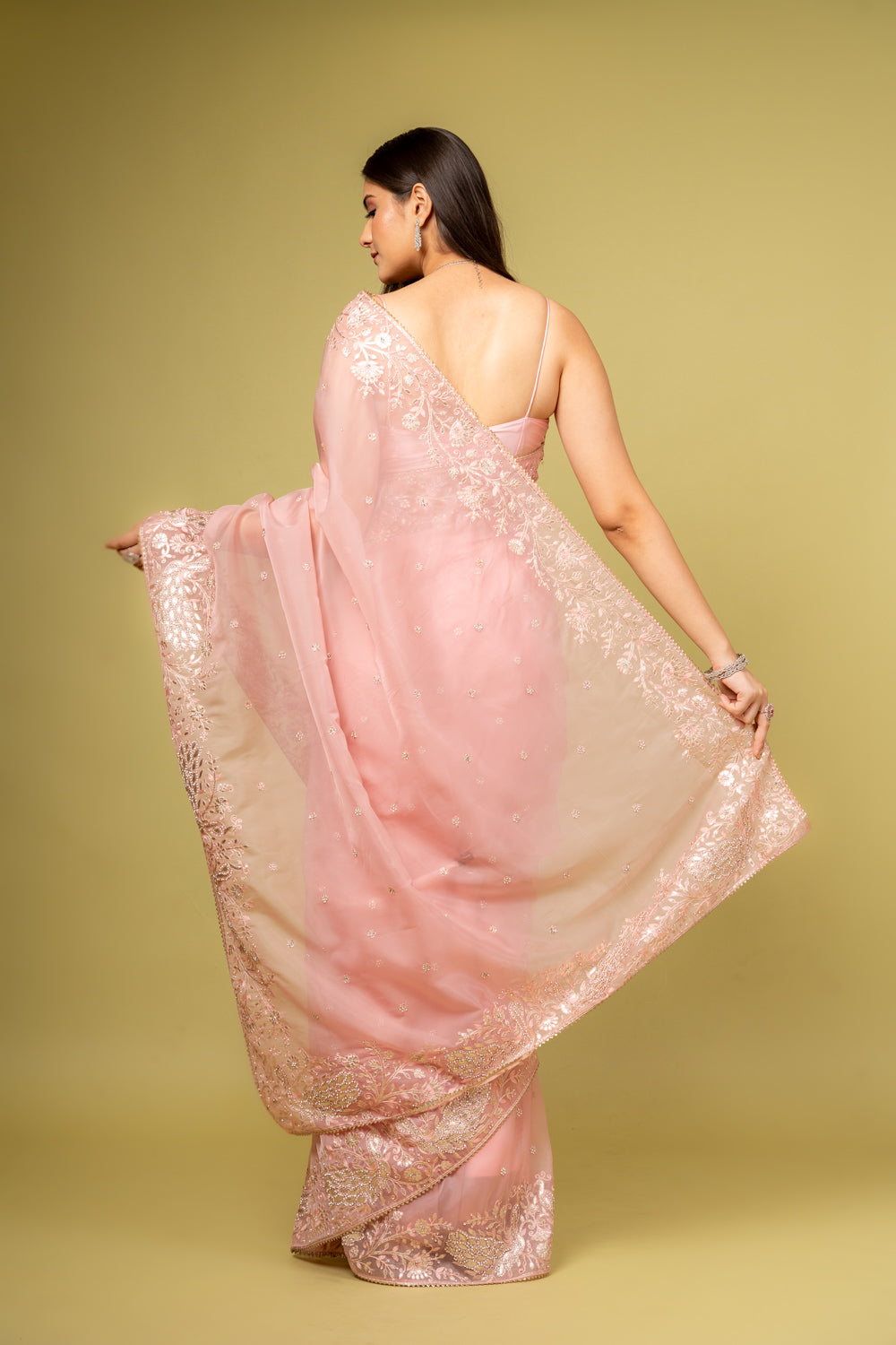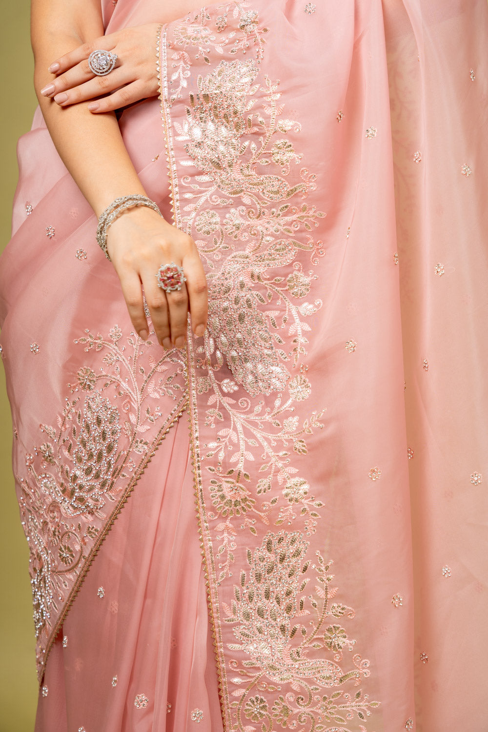 Step into elegance with this luxurious Organza Saree. The saree is heavily adorned with Intricate Silver Zari Embroidery Richly designed pallu is embellished with dense Floral embroidery, making it the highlight of the saree, and regal appeal—perfect for weddings, receptions, engagement parties, cocktail evenings, and festive celebrations.