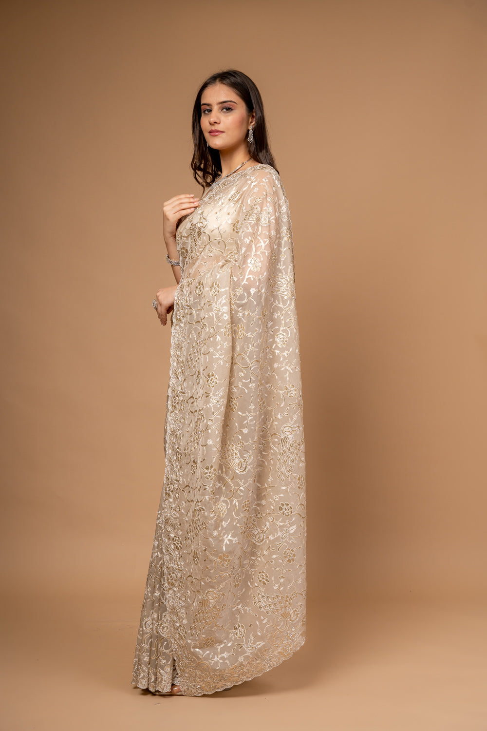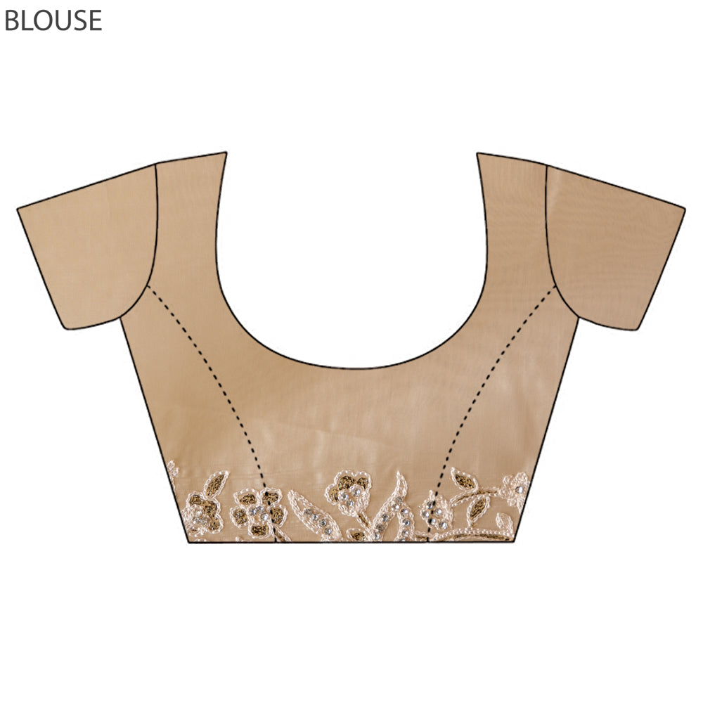 Step into elegance with this luxurious Organza Saree. The saree is heavily adorned with Intricate Silver Zari Embroidery Richly designed pallu is embellished with dense Floral embroidery, making it the highlight of the saree, and regal appeal—perfect for weddings, receptions, engagement parties, cocktail evenings, and festive celebrations.