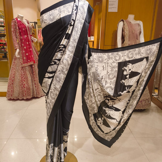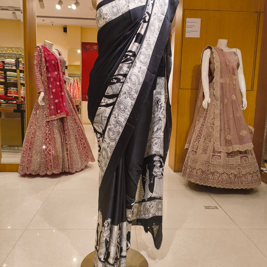 Panna Black Satin Digital Printed Saree With Unstitched Blouse