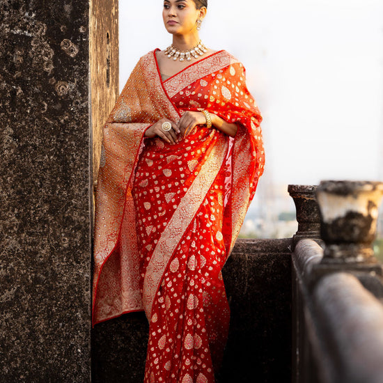 This saree is made from a lightweight and sheer fabric that has a subtle shine to it. It has a stiff and crisp texture that makes it perfect for formal occasions like weddings and parties. The saree is often embellished with delicate embroidery or embellishments, making it a statement piece.