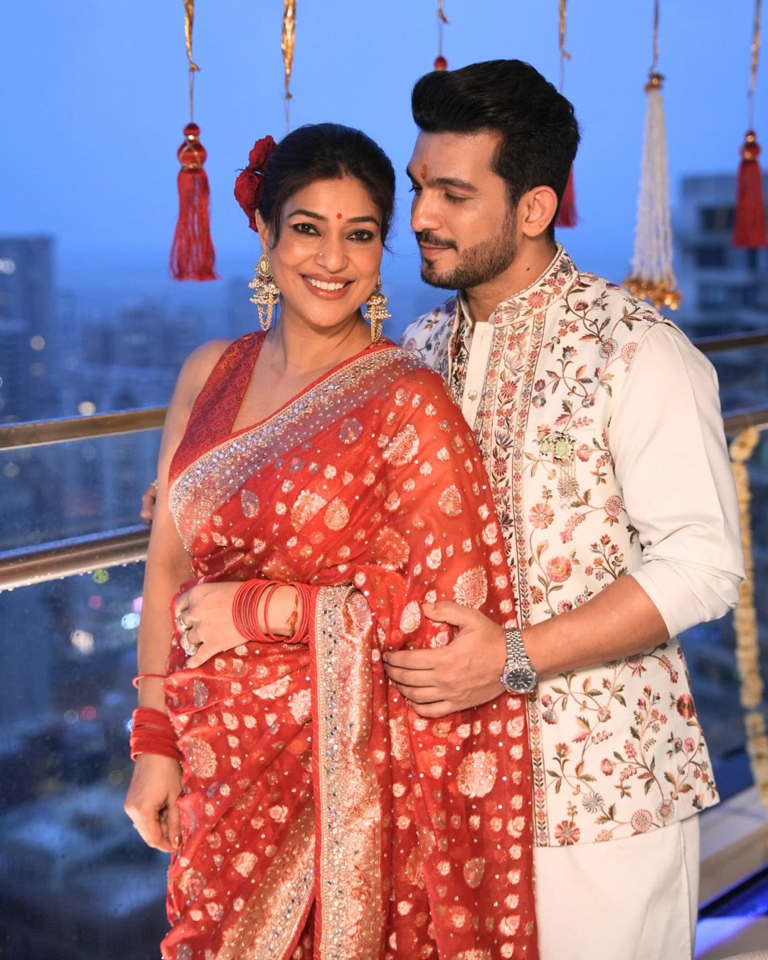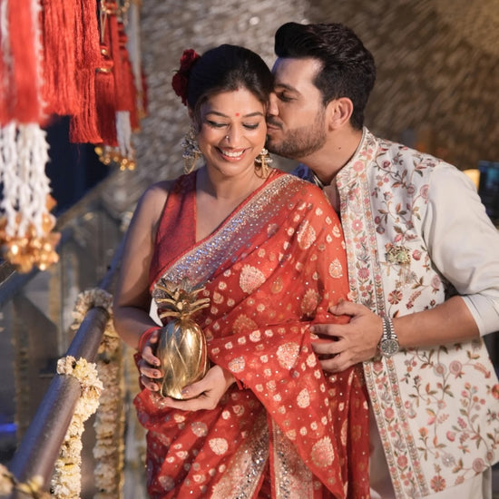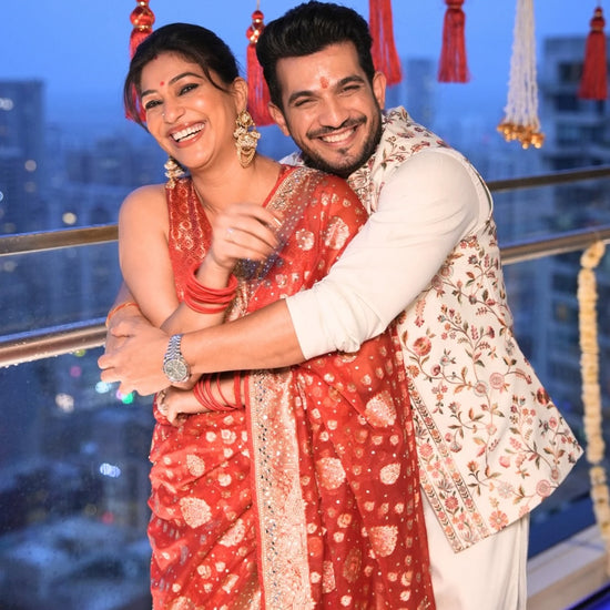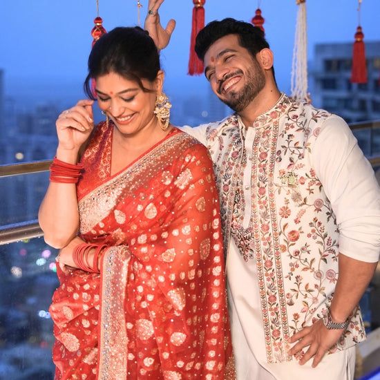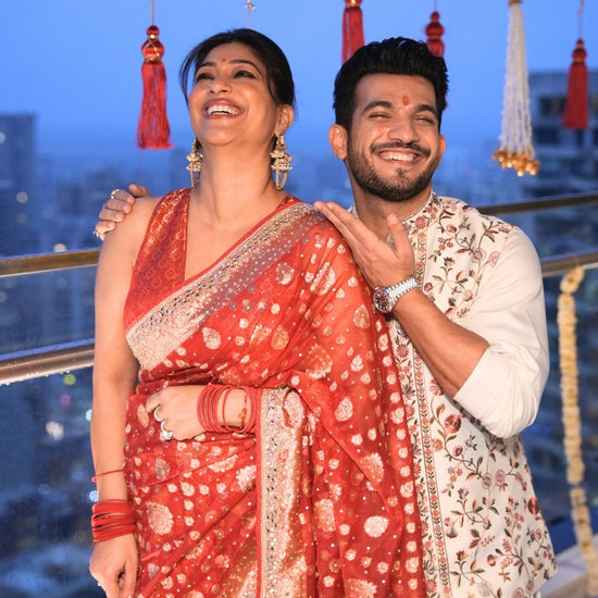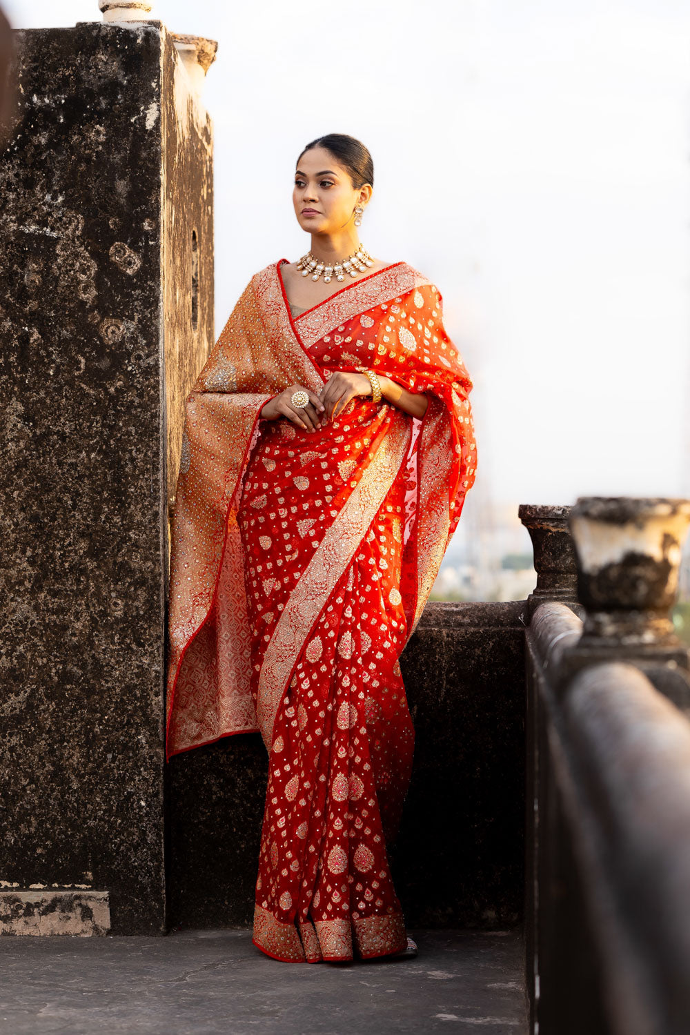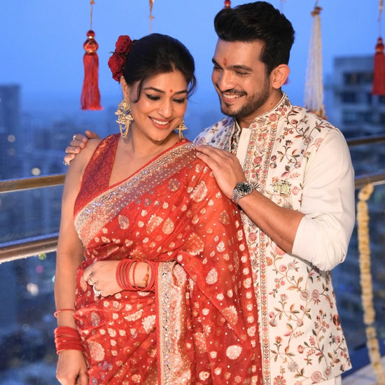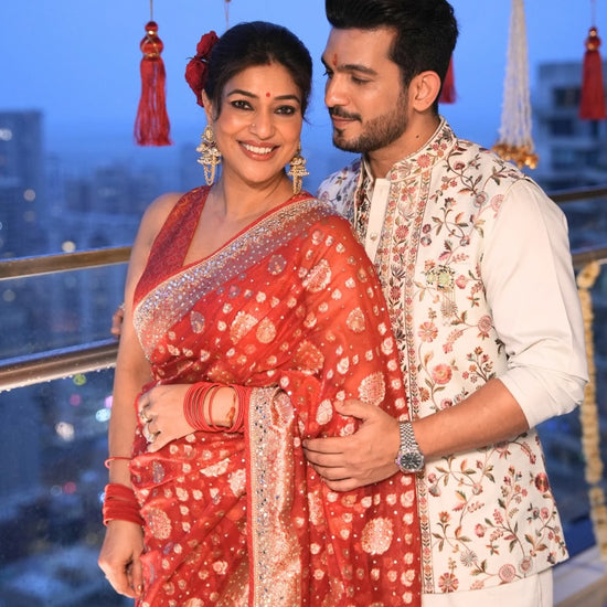Panna Red Organza Embroidered Saree With Unstitched Blouse (Ft:-Neha Bijlani)
