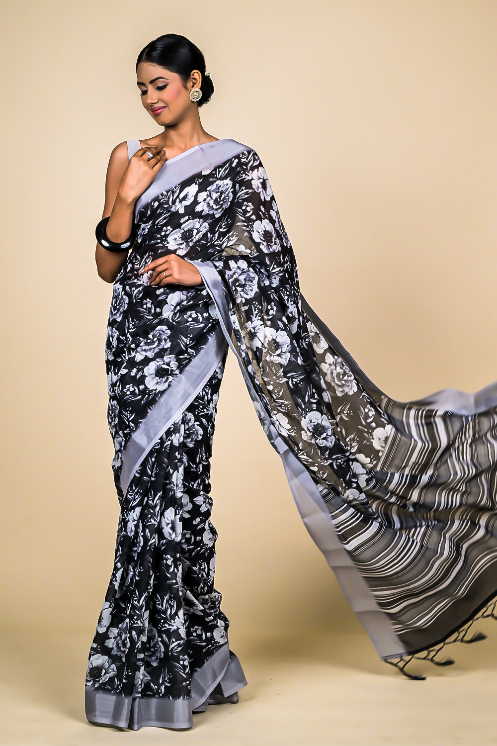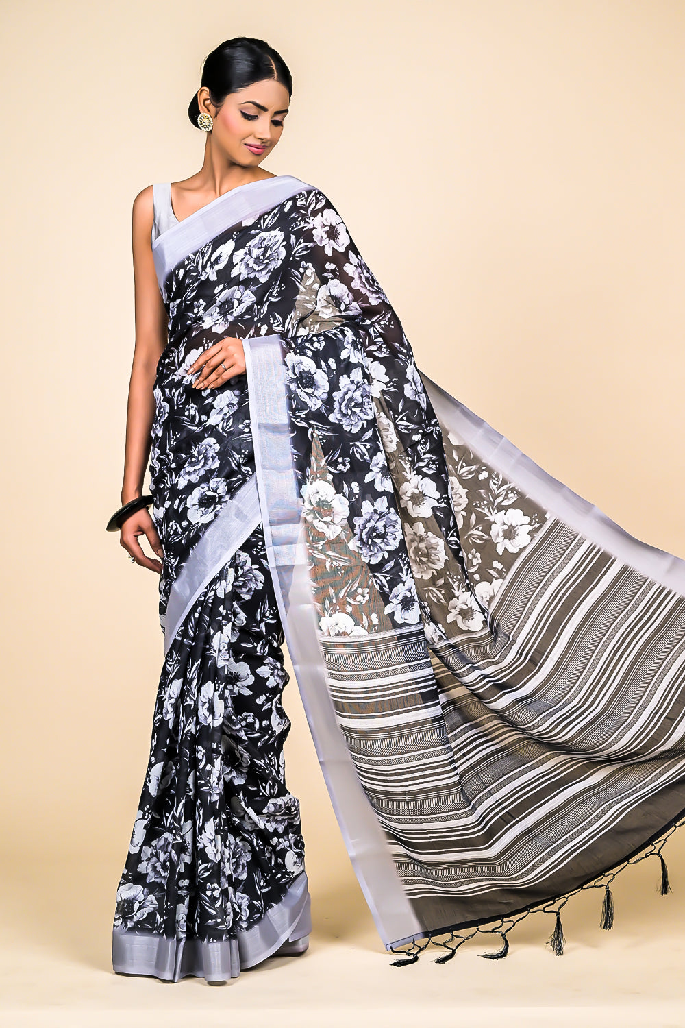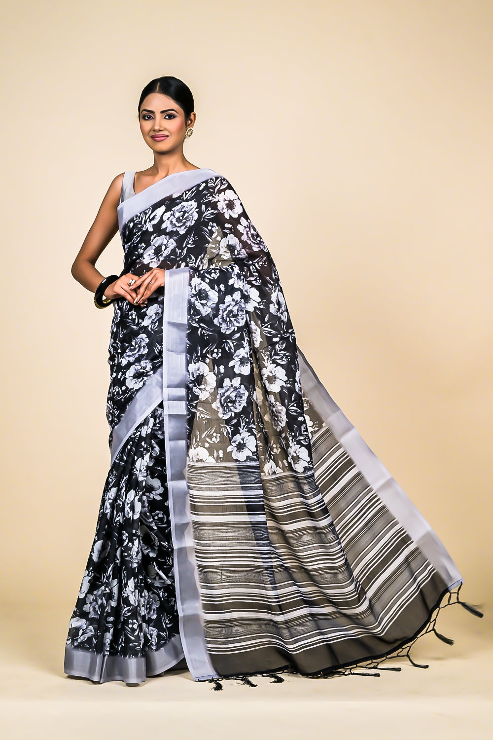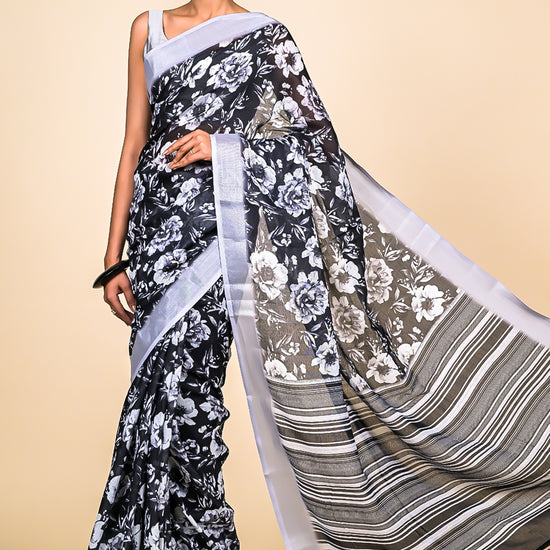 Panna Black Cotton Floral Print Saree With Unstitched Blouse