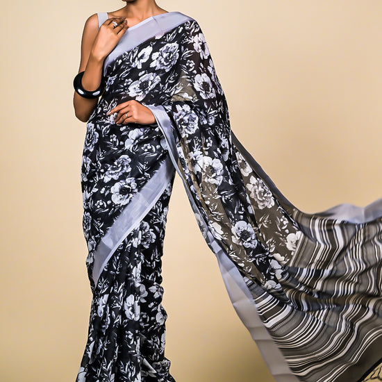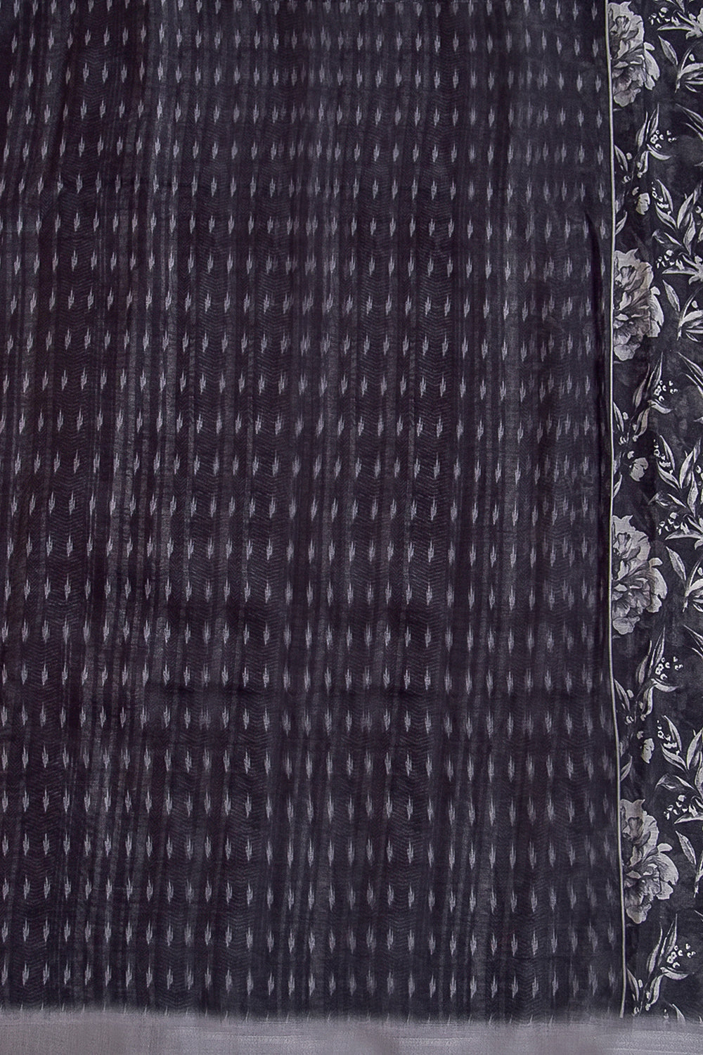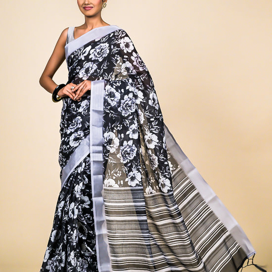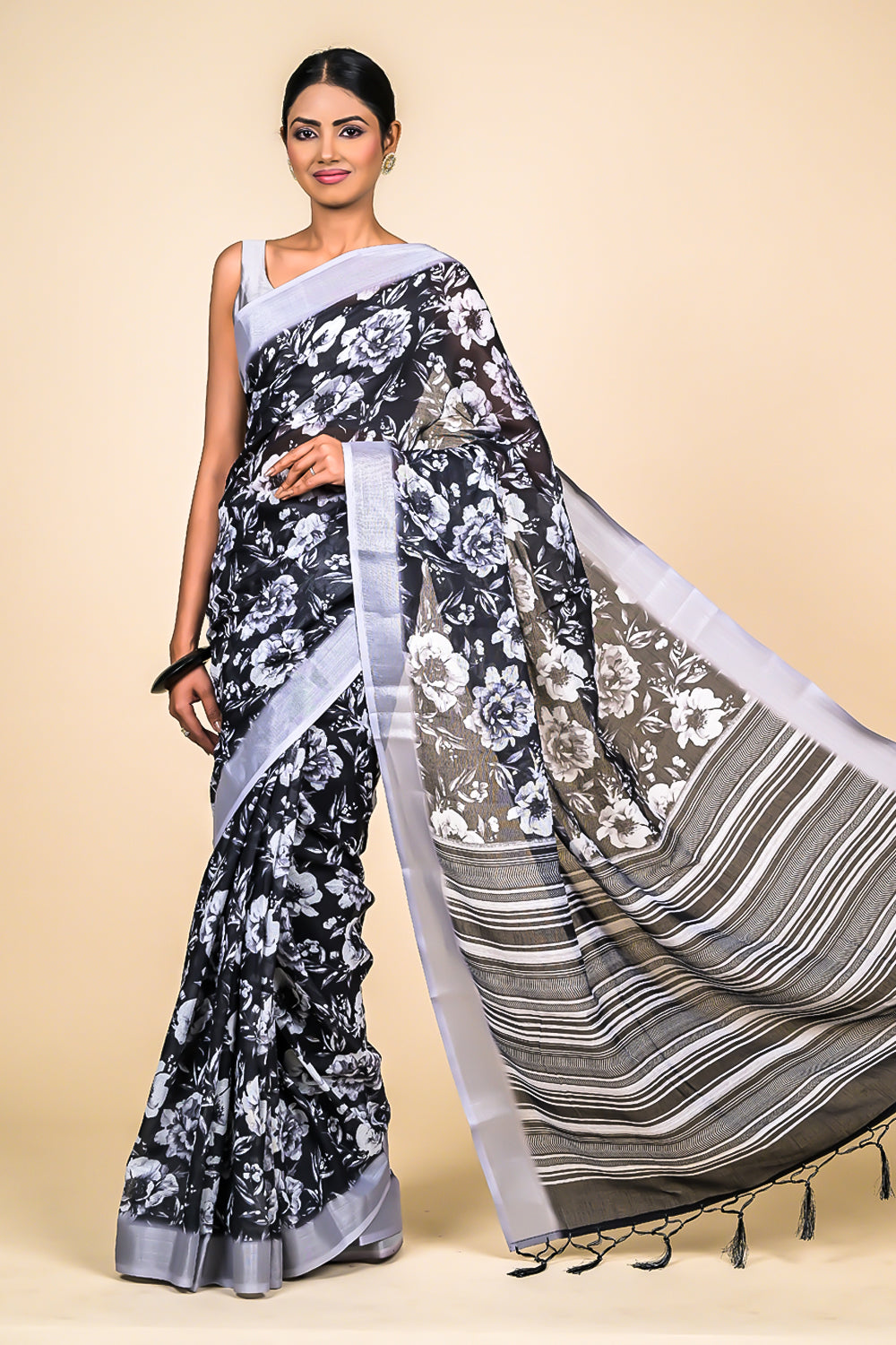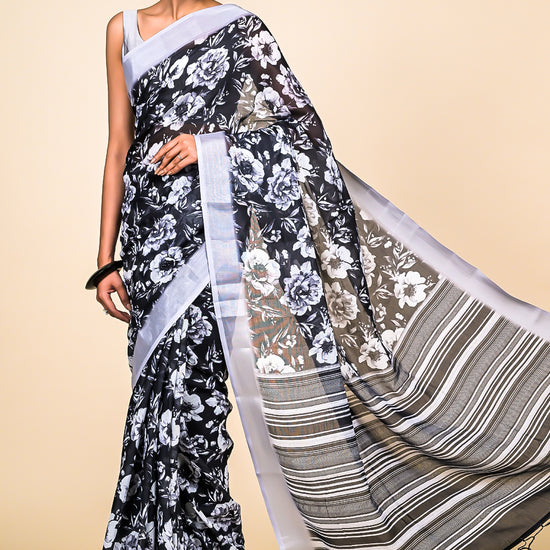 Panna Black Cotton Floral Print Saree With Unstitched Blouse