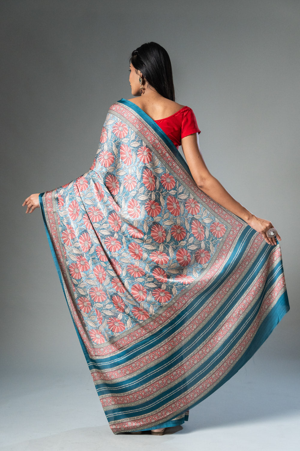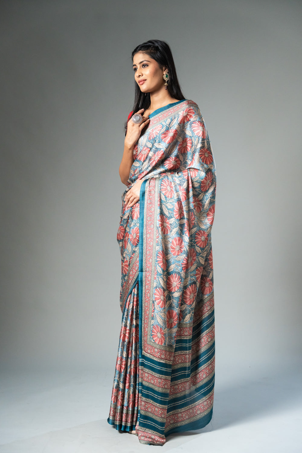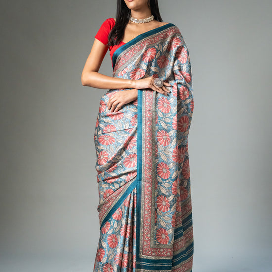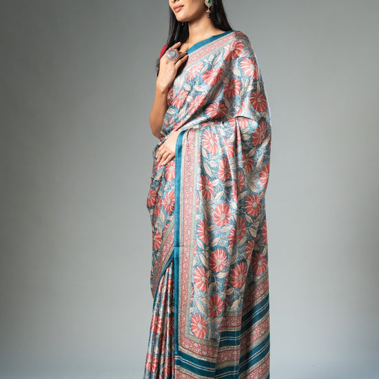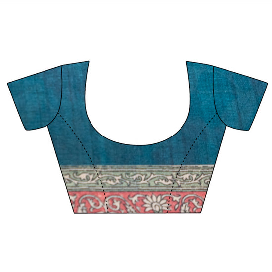 Panna Blue Grey Cotton Digital Print Saree With Unstitched Blouse