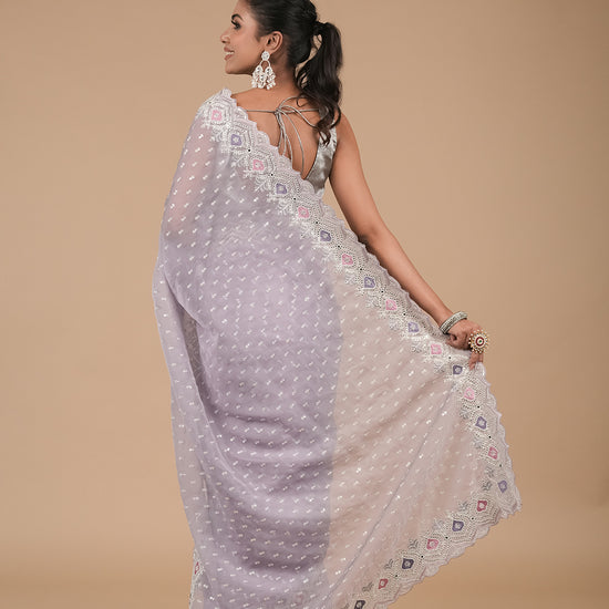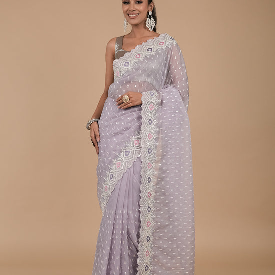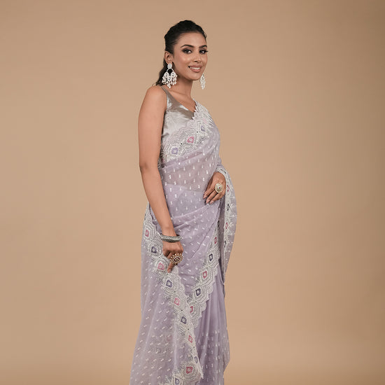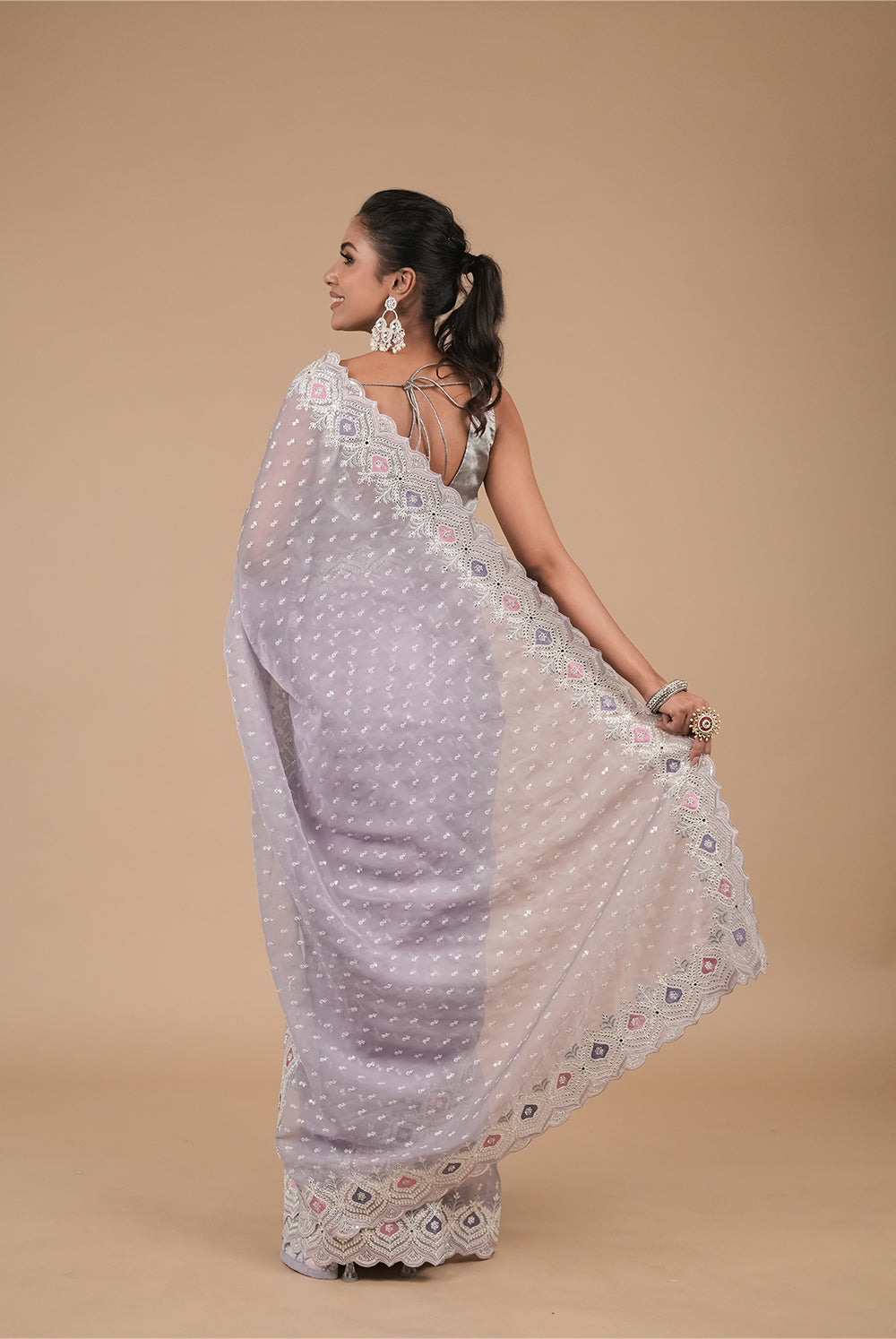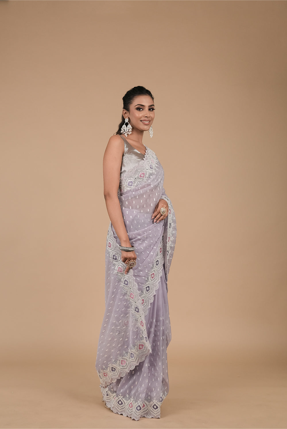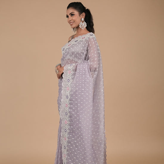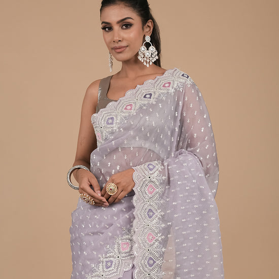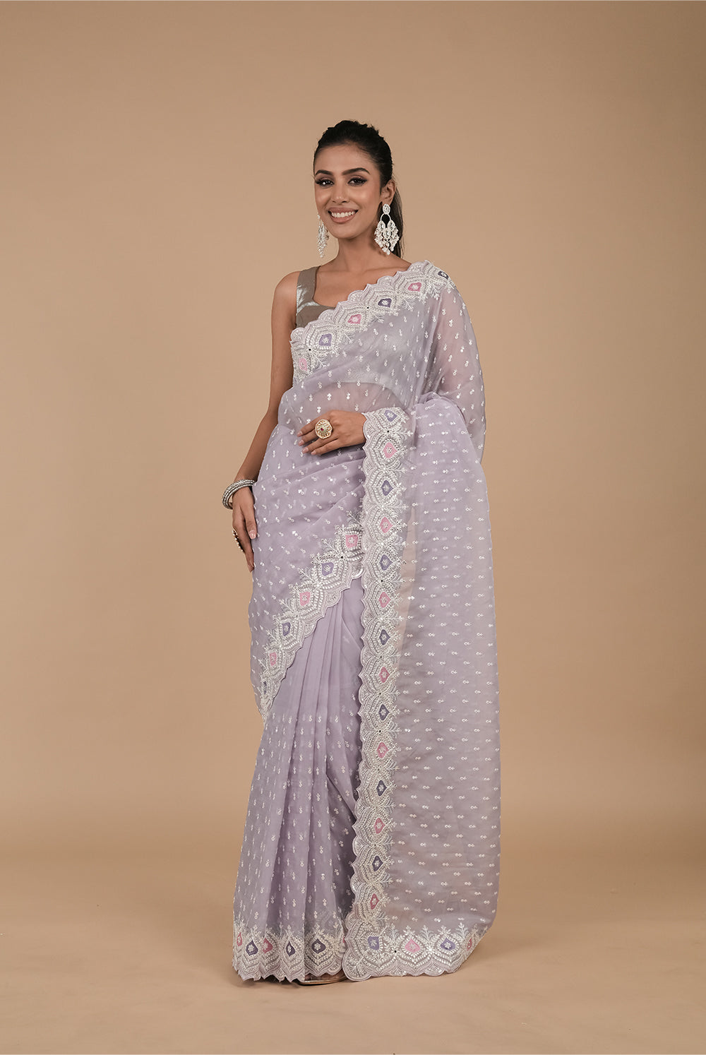 Panna Mauve Sequence & Threadwork, Embroidered Designer Organza Saree With Unstitched Blouse