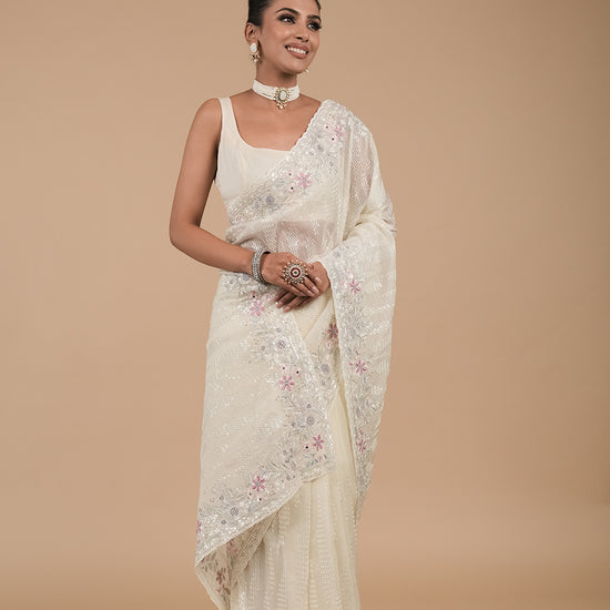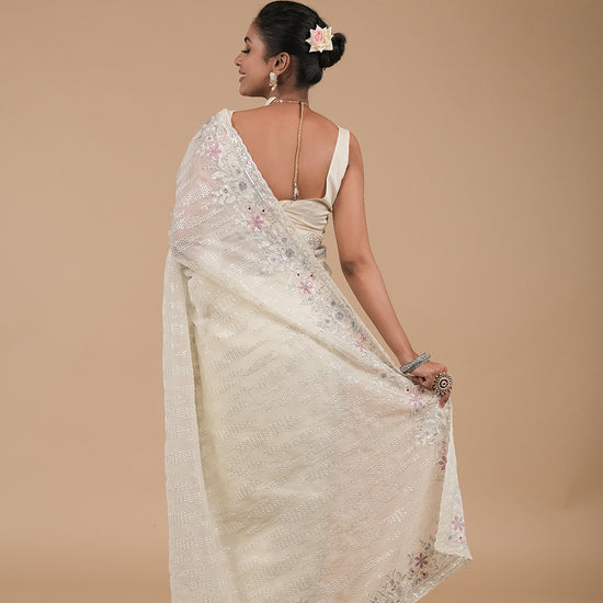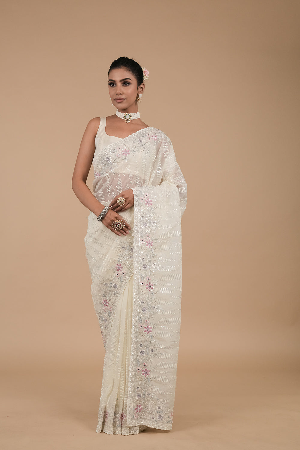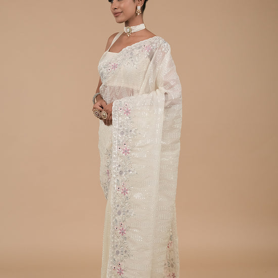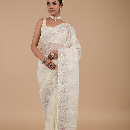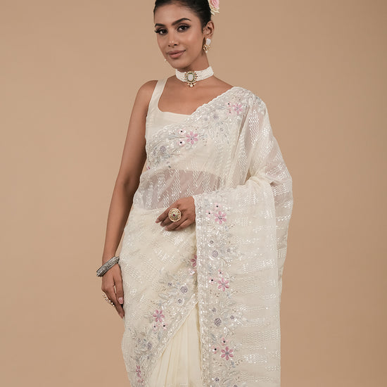 Panna Off White Sequence & Threadwork, Embroidered Designer Organza Saree With Unstitched Blouse
