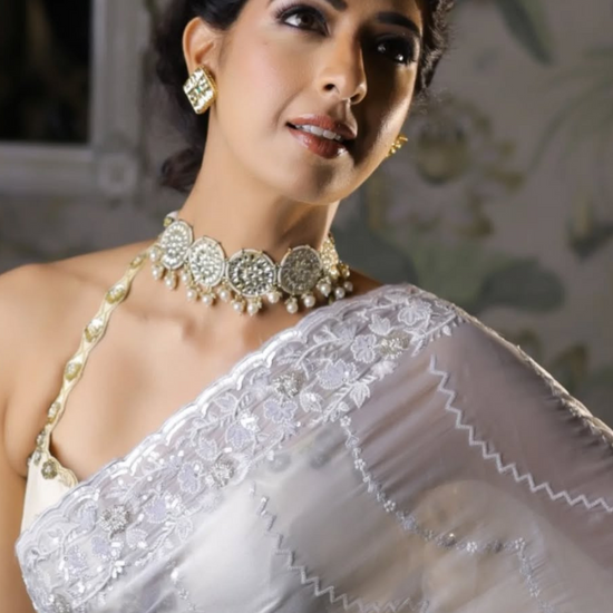 This uniquely crafted and truly desirable Organza saree is nothing less than a masterpiece. The matte finished motifs can easily create a luxurious statement.