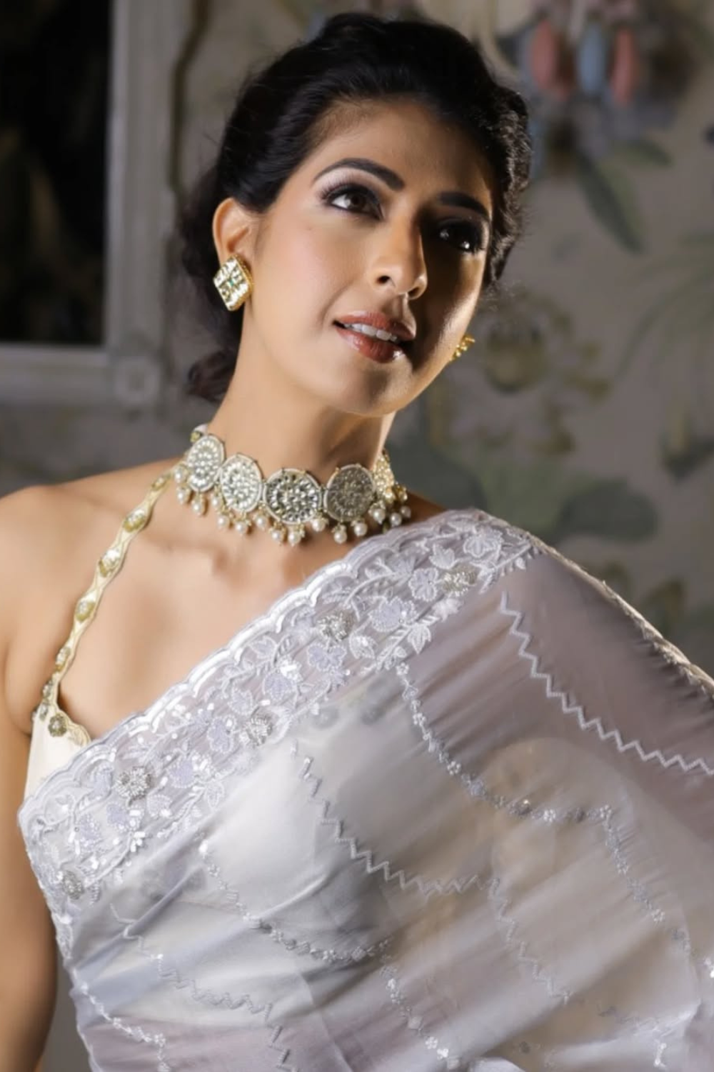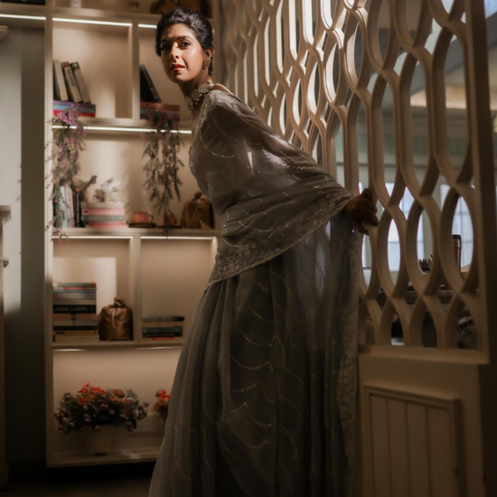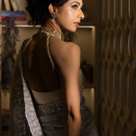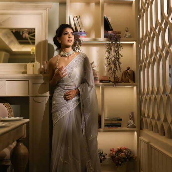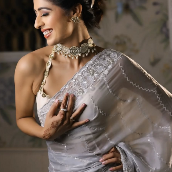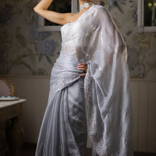 Panna Grey Sequence, Bead, Cutdana & Threadwork Designer Organza Saree With Unstitched Blouse(Ft:-Aishwarya Sakhuja Nag)