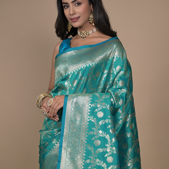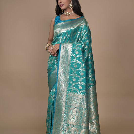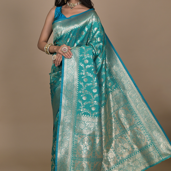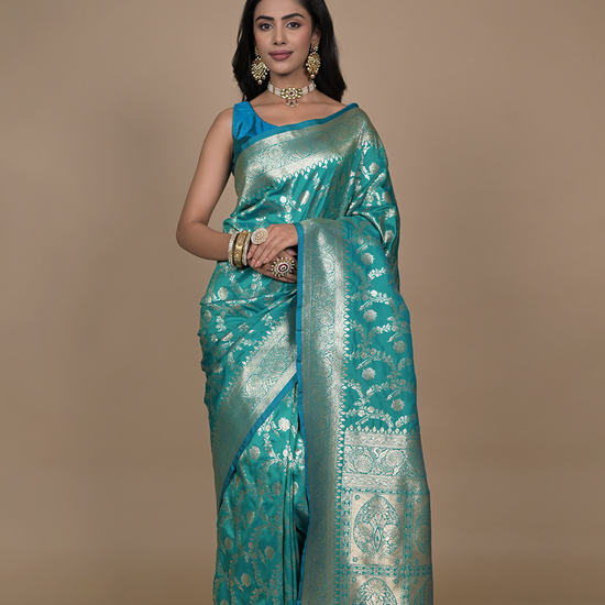 Panna Rama Woven Zari Banarasi Silk Saree With Unstitched Blouse