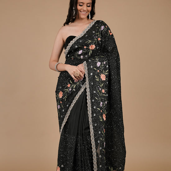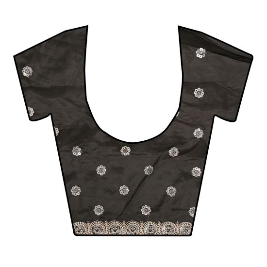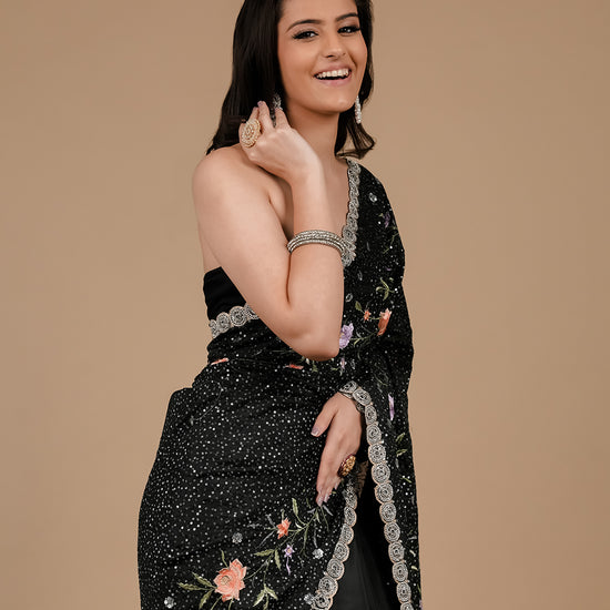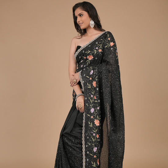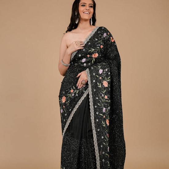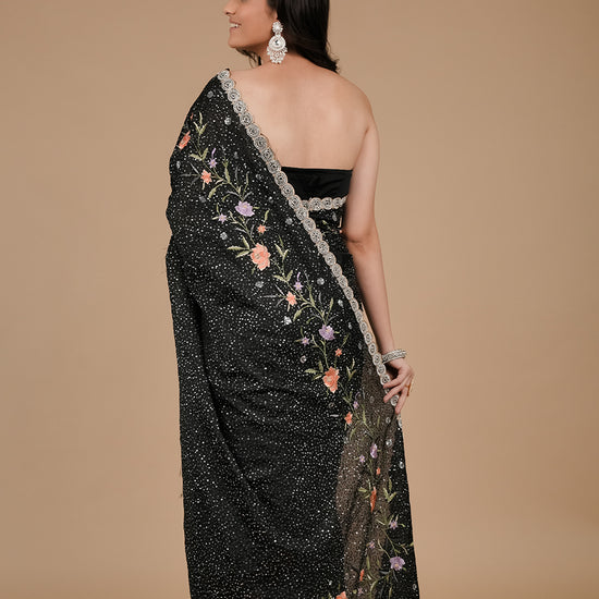 Panna Black Sequence, Threadwork & Zarkan Organza Saree With Unstitched Blouse
