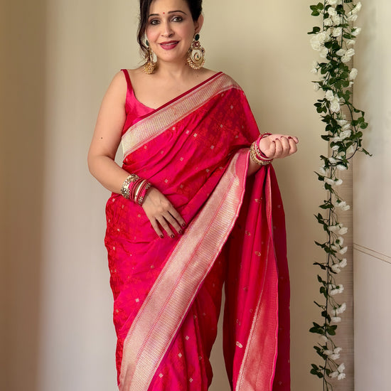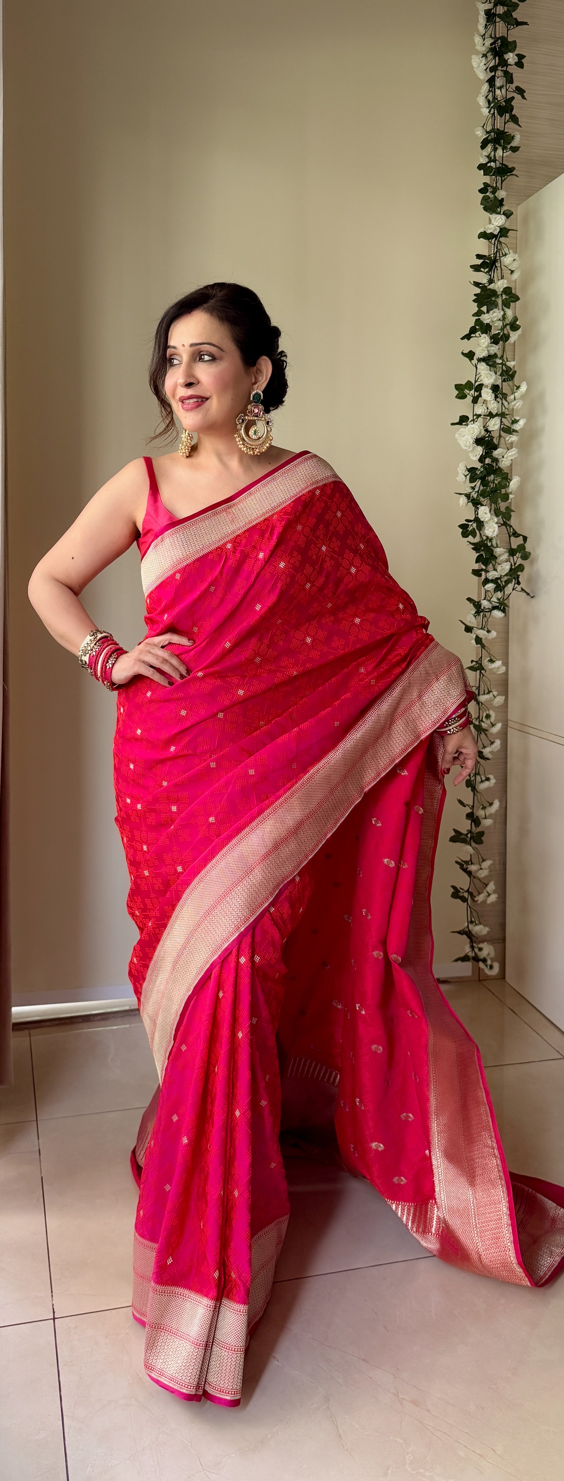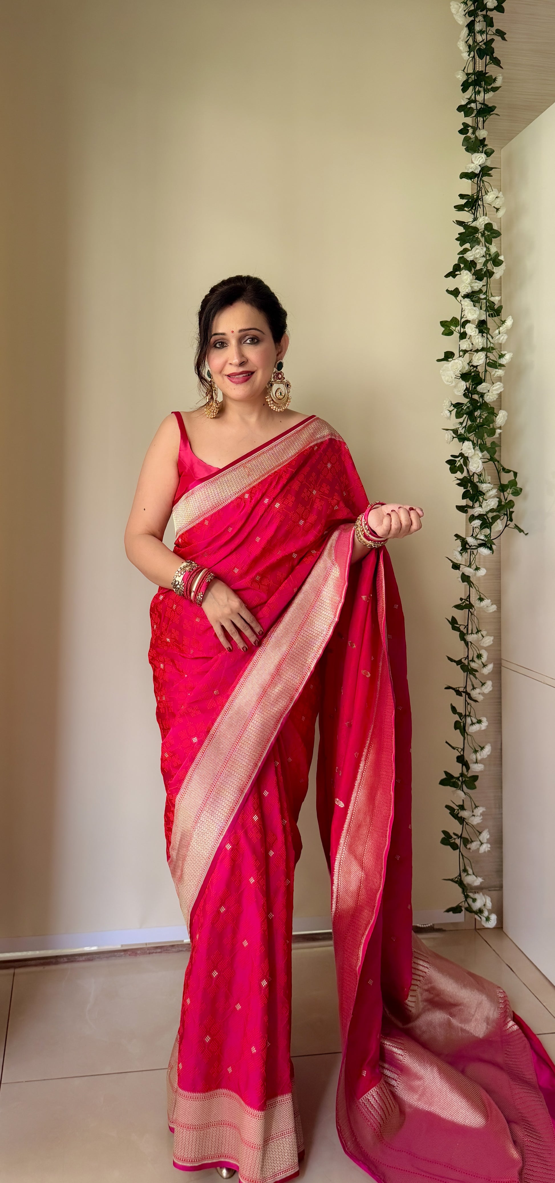 Panna Timeless Elegance Rani Bandhani Gharchola Zari Border Banarasi Silk Saree With Unstitched Blouse (Ft:-Anjan Prasad)