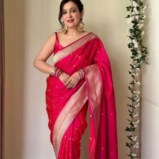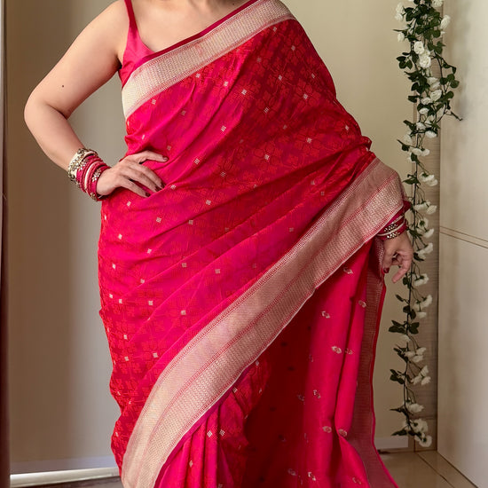 Step into timeless elegance with this exquisite saree that blends traditional artistry with regal charm. Draped in a Vibrant Pink Hue, it features delicate Bandhani-inspired dotted motifs across the body, enhanced by the classic Gharchola design elements. The highlight of the saree is its golden zari border and pallu, which add a royal touch to your festive look. This saree is more than attire—it’s a heritage piece. The vibrant pink with golden zari work ensures you shine