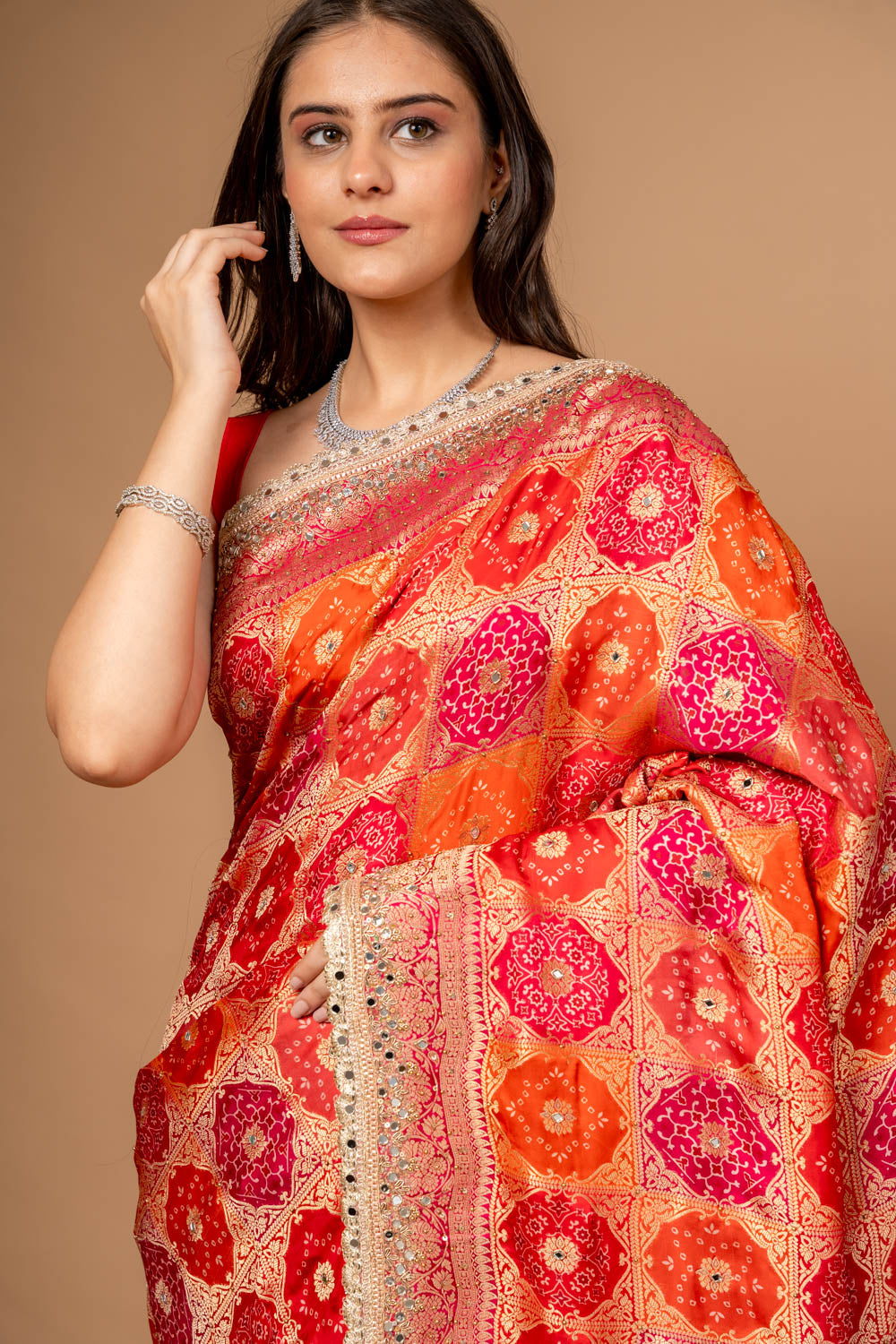 Pair with kundan or pearl jewelry for a royal look