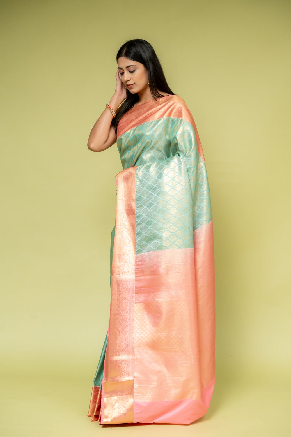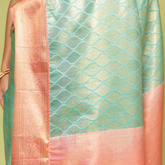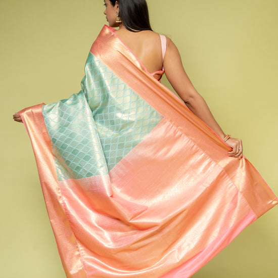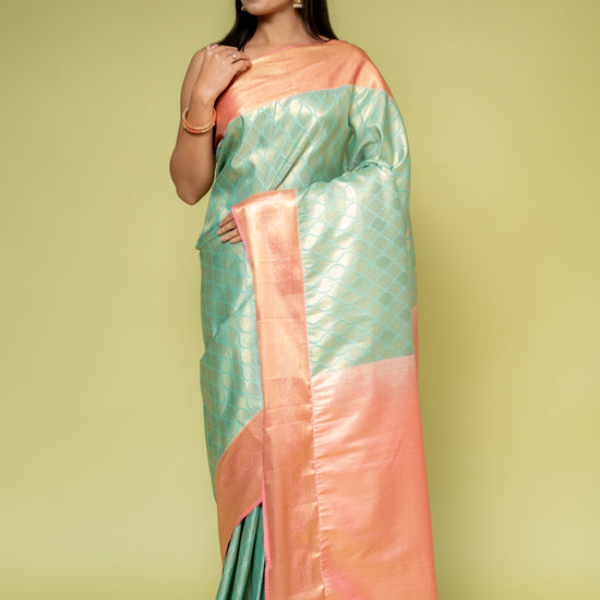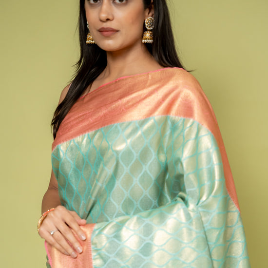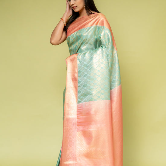 Panna Tea Green Banarasi Silk Saree With Unstitched Blouse