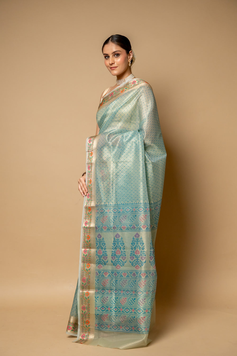 Panna Tea Green Banarasi Woven Zari & Digital Printed Cotton Saree With Unstitched Blouse