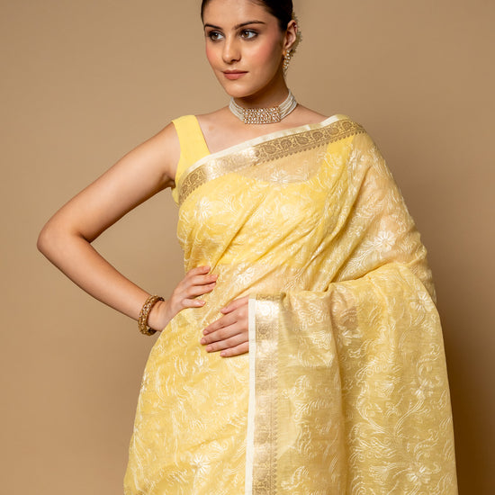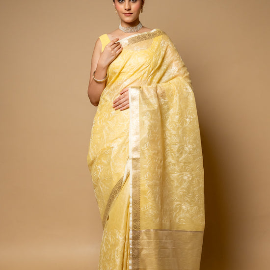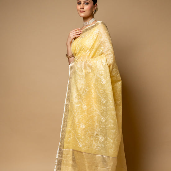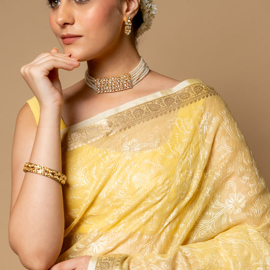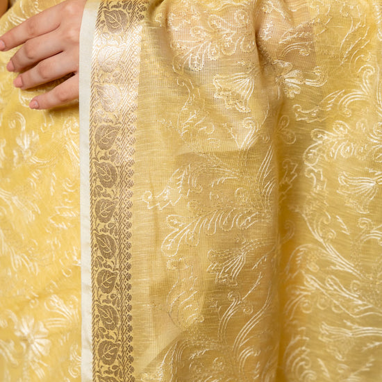 Lemon Gold Banarasi Woven Zari & Threadwork Cotton Saree With Unstitched Blouse