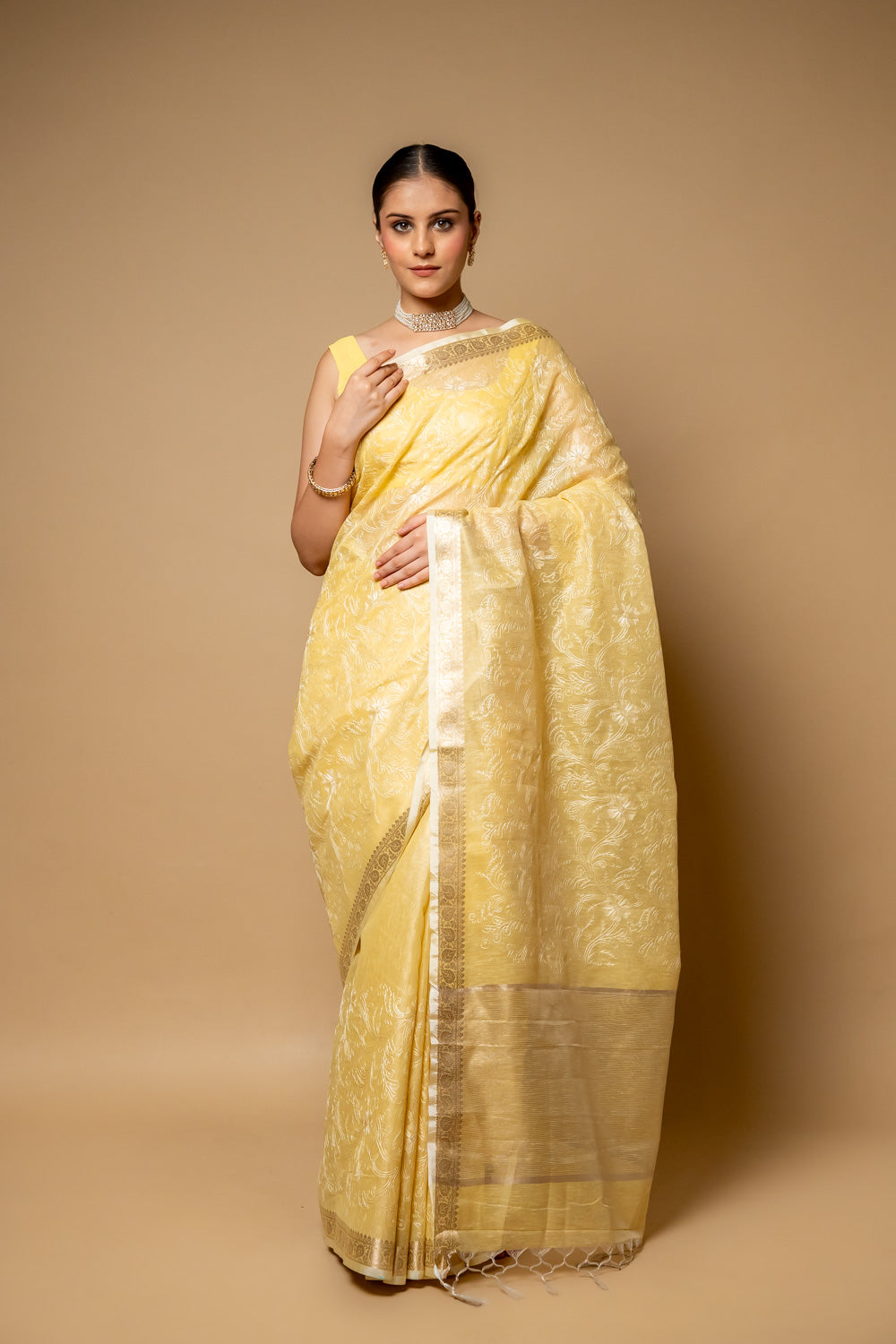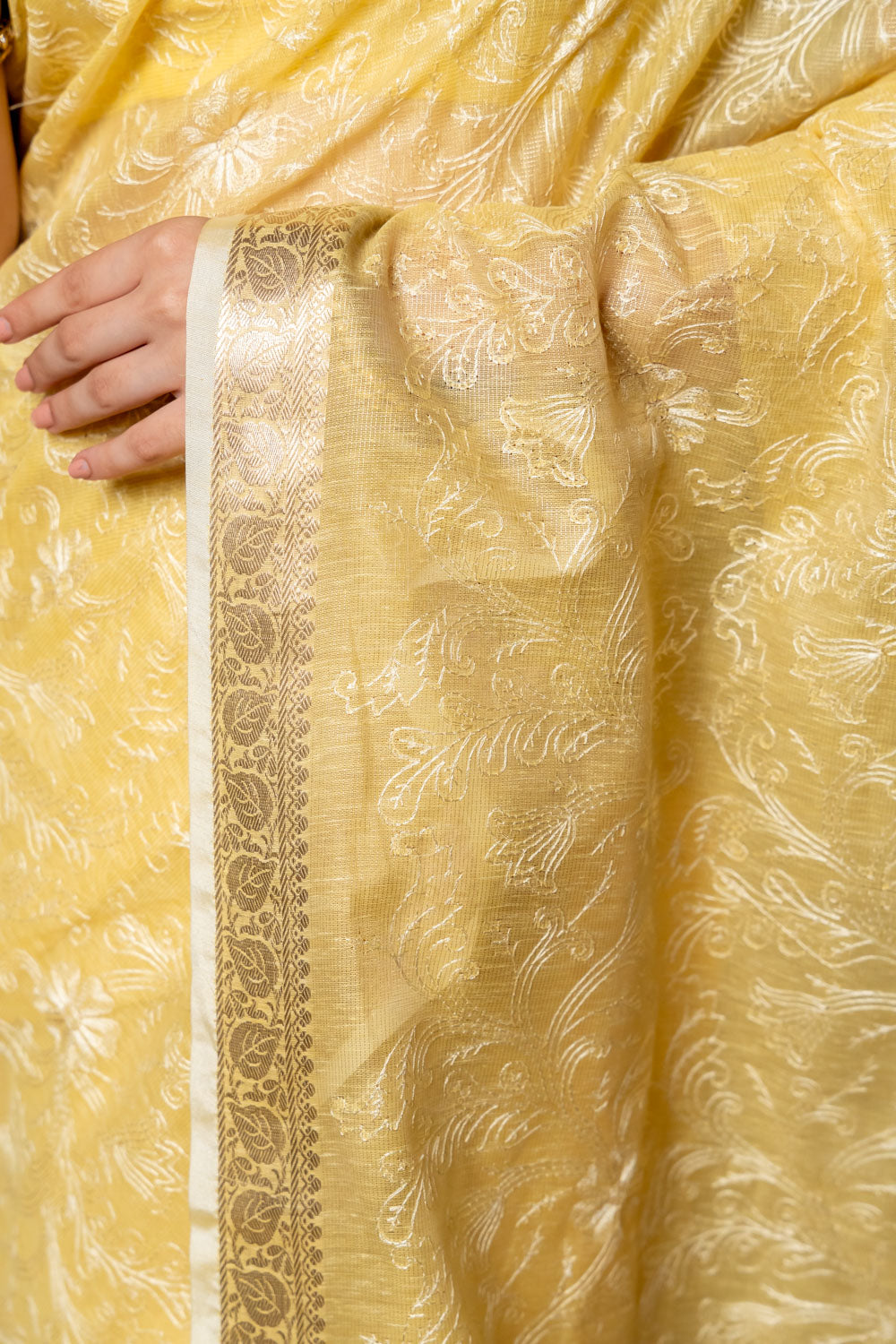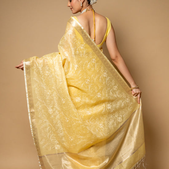 Lemon Gold Banarasi Woven Zari & Threadwork Cotton Saree With Unstitch – The Panna Shop
