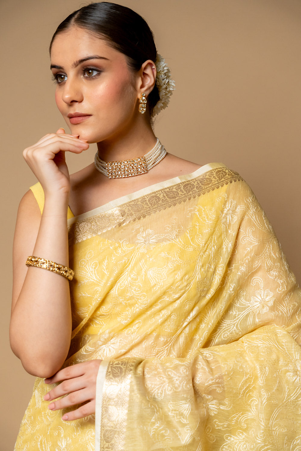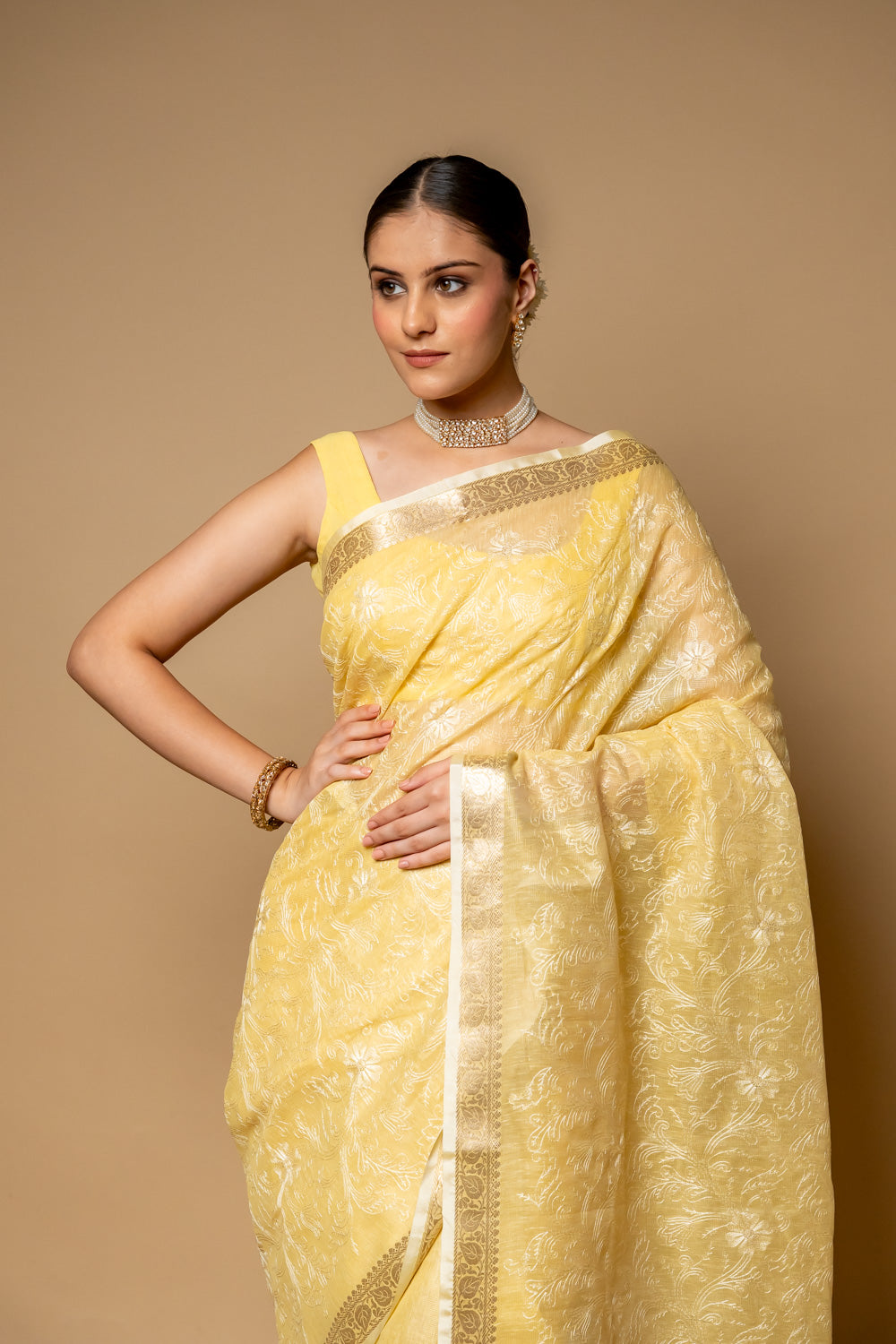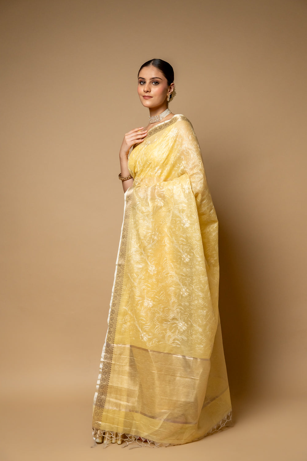 Lemon Gold Banarasi Woven Zari & Threadwork Cotton Saree With Unstitch – The Panna Shop