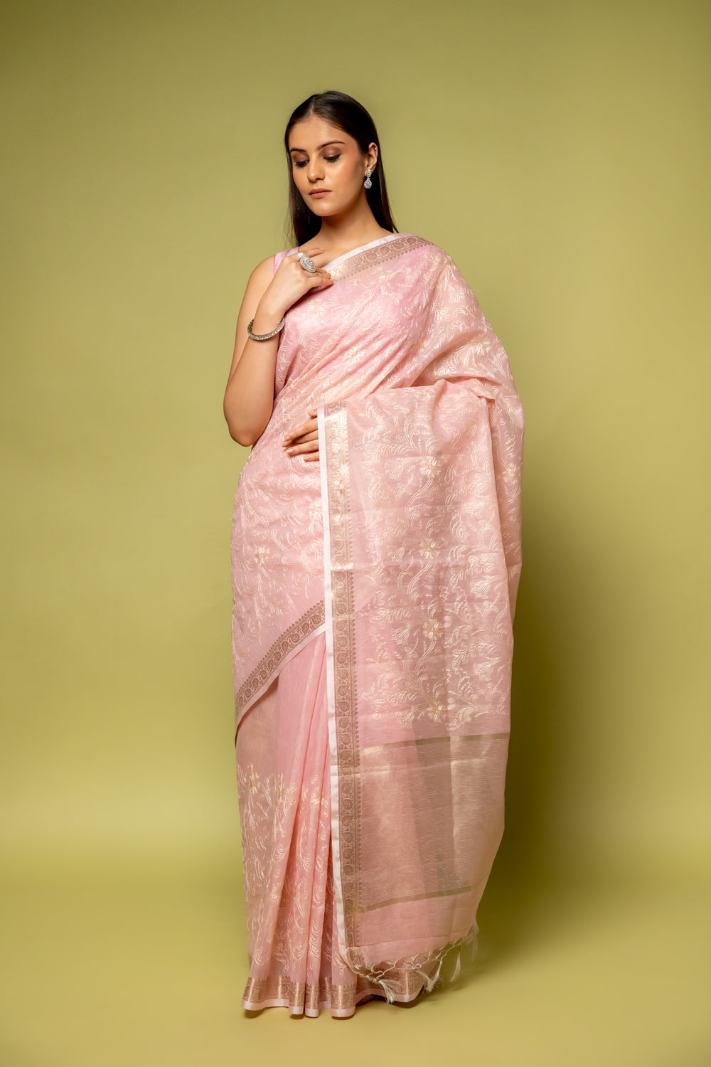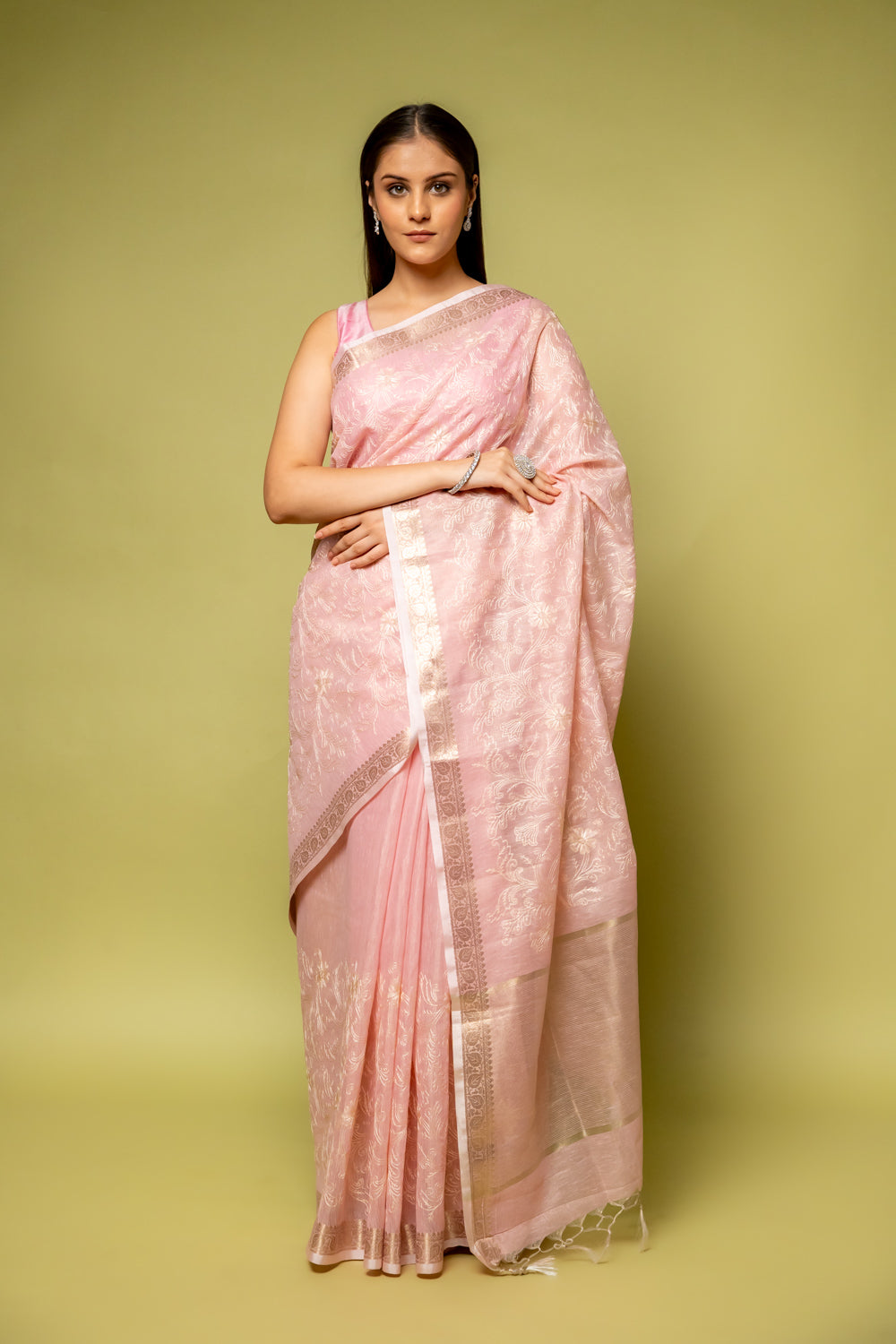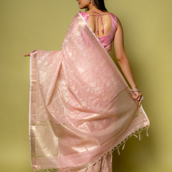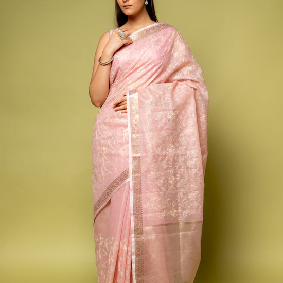 Pink Banarasi Woven Zari & Threadwork Cotton Saree With Unstitched Blo – The Panna Shop