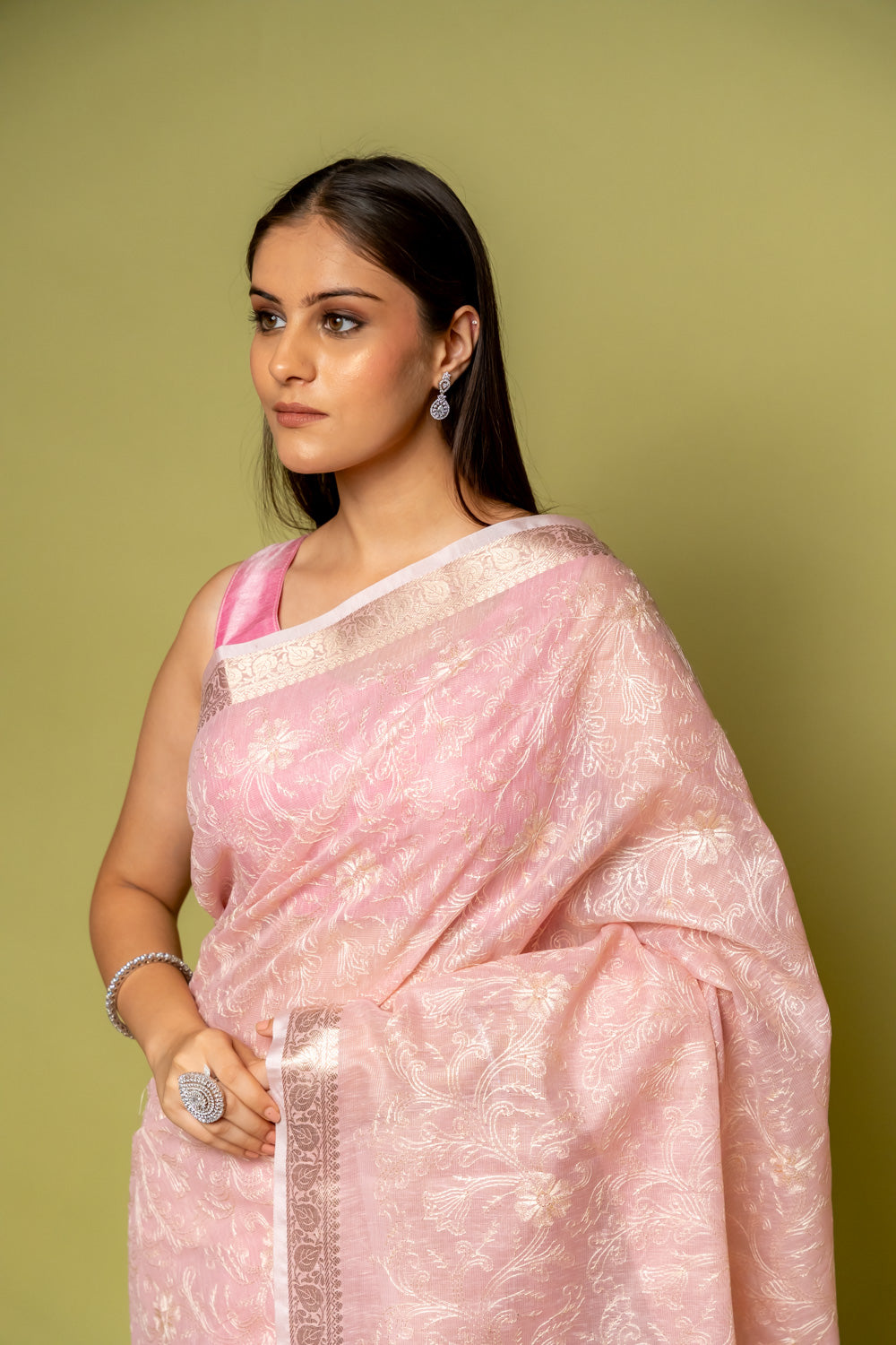 Pink Banarasi Woven Zari & Threadwork Cotton Saree With Unstitched Blouse