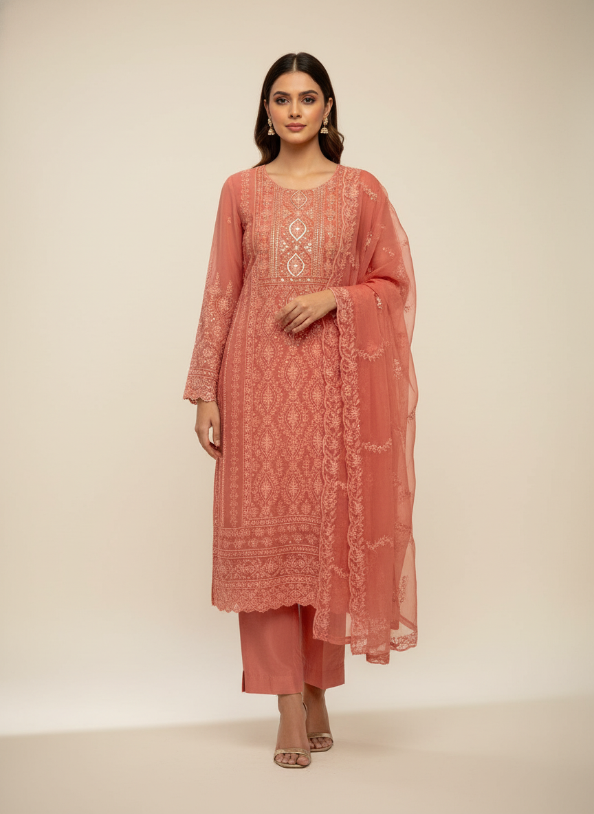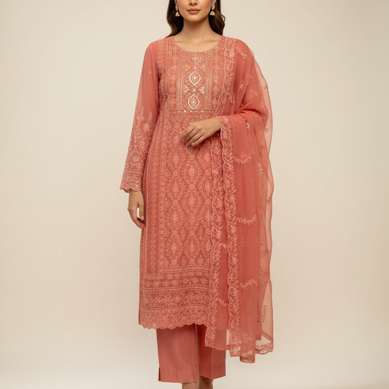 Step into contemporary elegance with this unstitched Georgette suit, crafted to capture the perfect blend of grace and glamour. The lightweight and flowy Georgette fabric ensures effortless draping and comfort