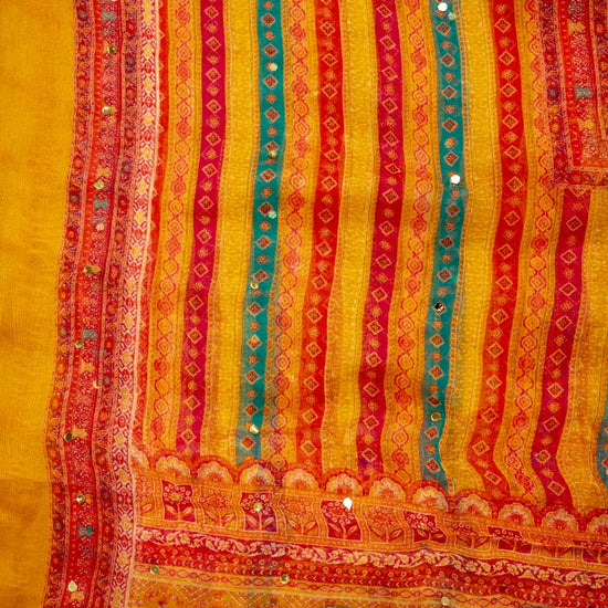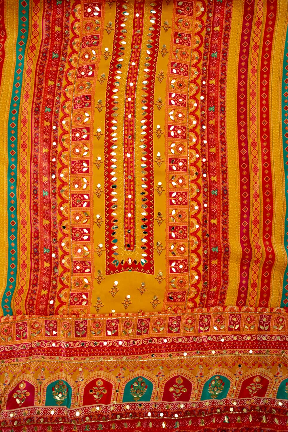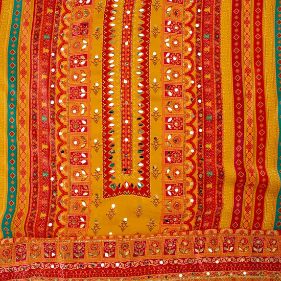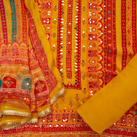 The ensemble features vibrant Digital prints that add a touch of freshness, enhanced with intricate Gotta Patti detailing and sparkling Mirror work for a festive radiance.
