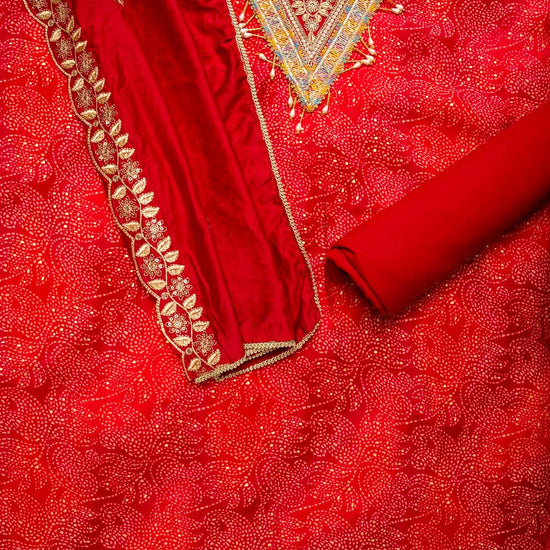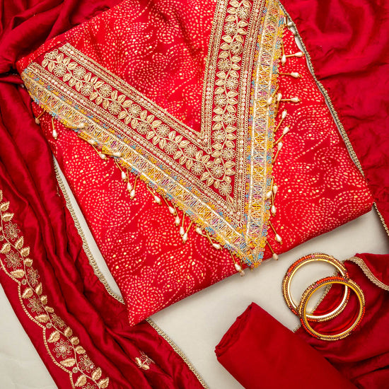 The suit features classic Bandhani prints that celebrate timeless artistry, beautifully enhanced with delicate Sequence highlights, fine Thread embroidery, and rich Zari thread work for a subtle festive shimmer.