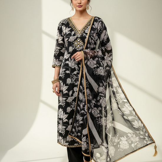 Step into effortless elegance with this stunning Black unstitched suit set, a perfect blend of traditional artistry and modern grace.