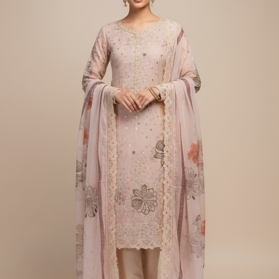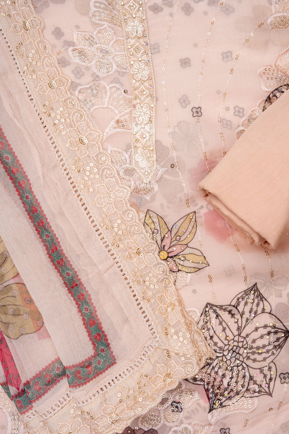 Step into contemporary elegance with this unstitched Georgette suit, crafted to capture the perfect blend of grace and glamour. The lightweight and flowy Georgette fabric ensures effortless draping and comfort