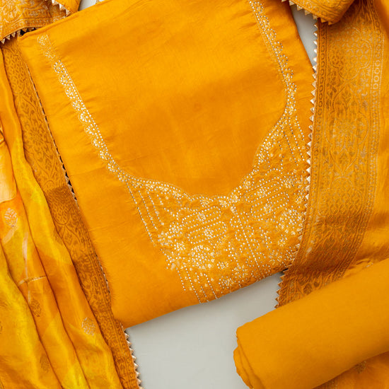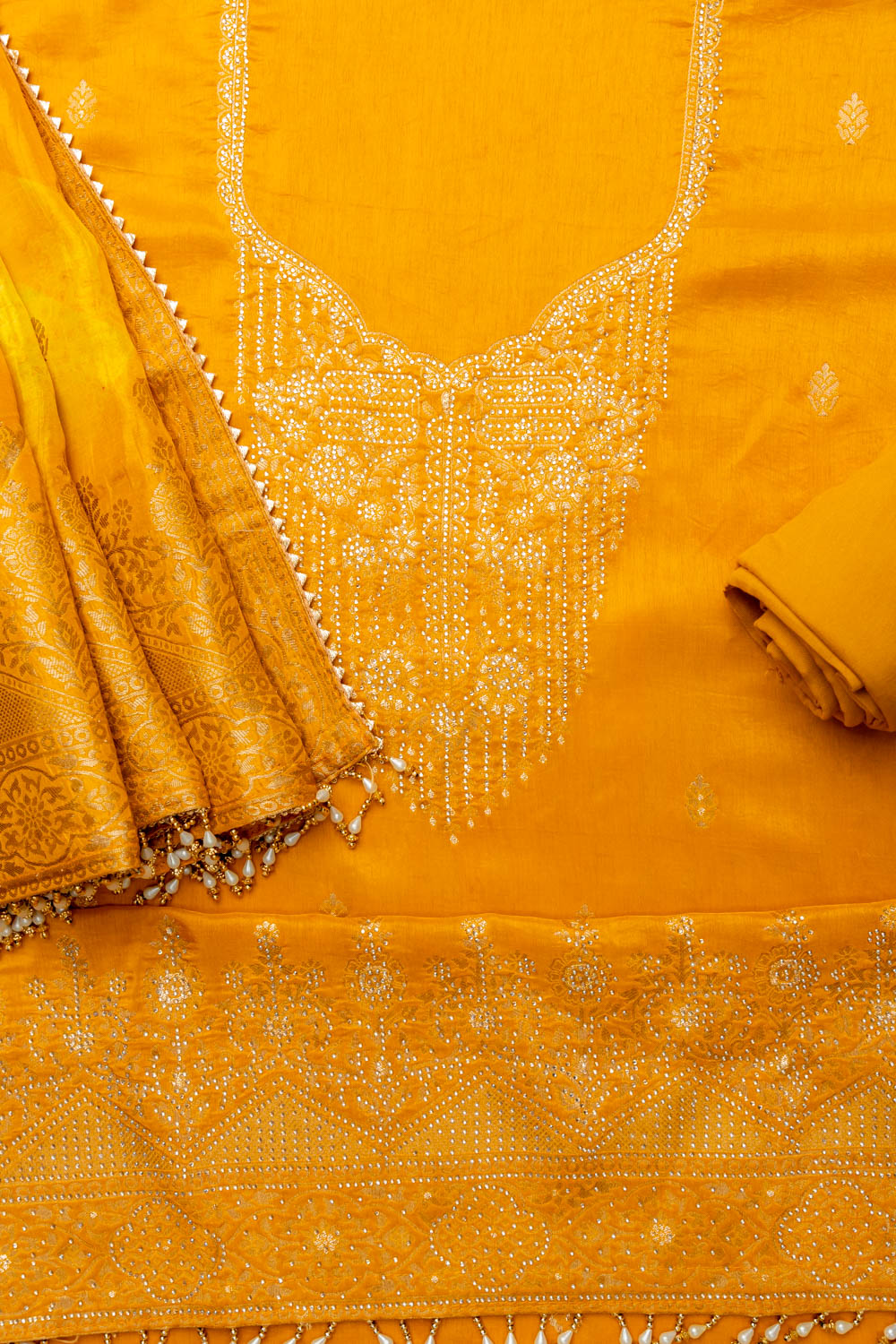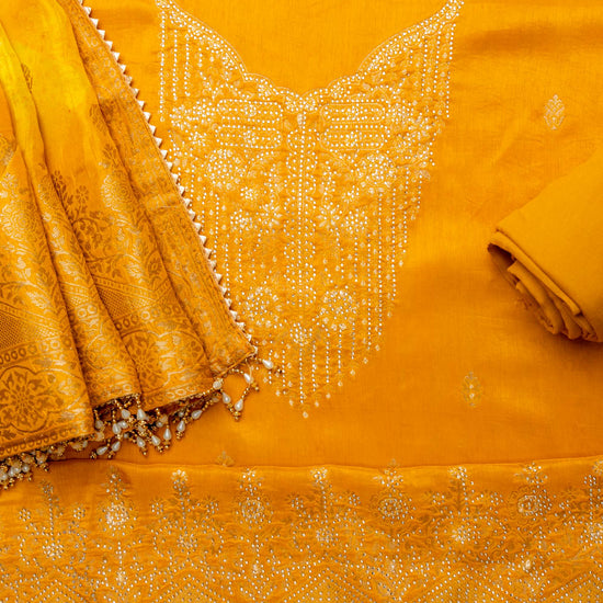 Redefine elegance with this stunning Georgette Unstitched Suit Set, crafted to bring together timeless tradition and contemporary charm. The soft, flowy Georgette fabric offers a refined drape and effortless comfort, making it perfect for festive and occasion wear.