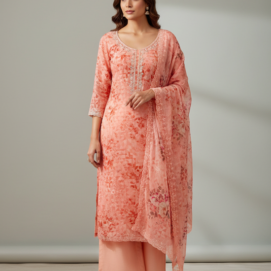 Step into refined elegance with this unstitched Georgette suit, a perfect blend of modern glamour and timeless charm. Crafted from lightweight and flowy Georgette fabric, it drapes beautifully for a graceful silhouette