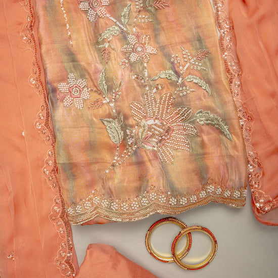 The suit features vibrant Digital prints that add a modern artistic touch, beautifully enhanced with intricate Cutdana detailing, delicate Sequence work, and sparkling Zarkan embellishments.