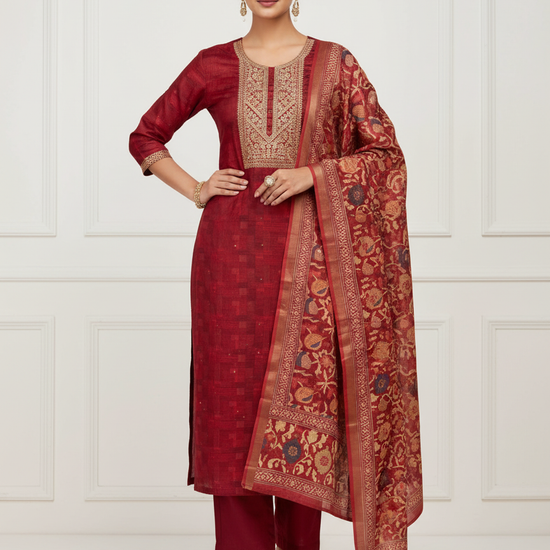 Panna Heritage Heirloom Maroon Cotton Unstitched Salwar Kameez With Cotton Dupatta