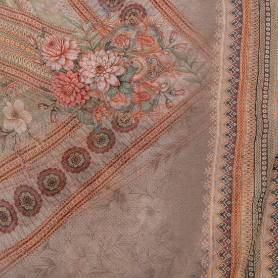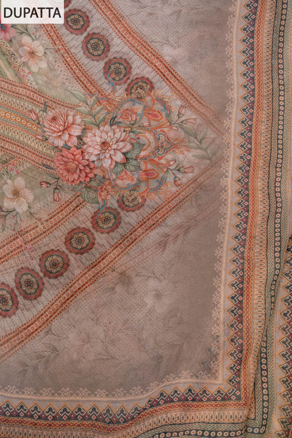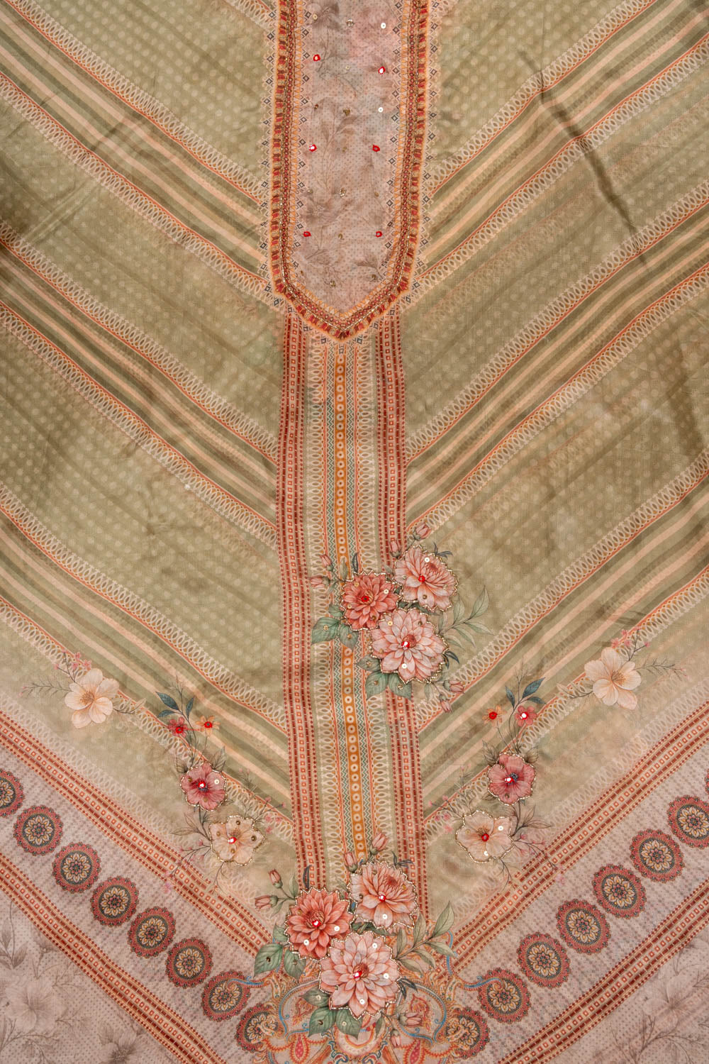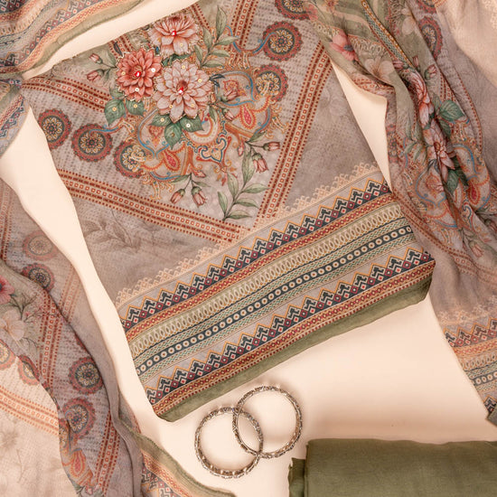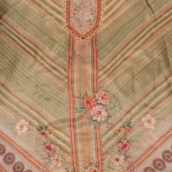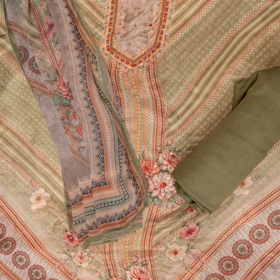 Panna Pista Mirror Sheet, Threadwork & Digital Printed Cotton Unstitched Salwar Suit With Chiffon Dupatta