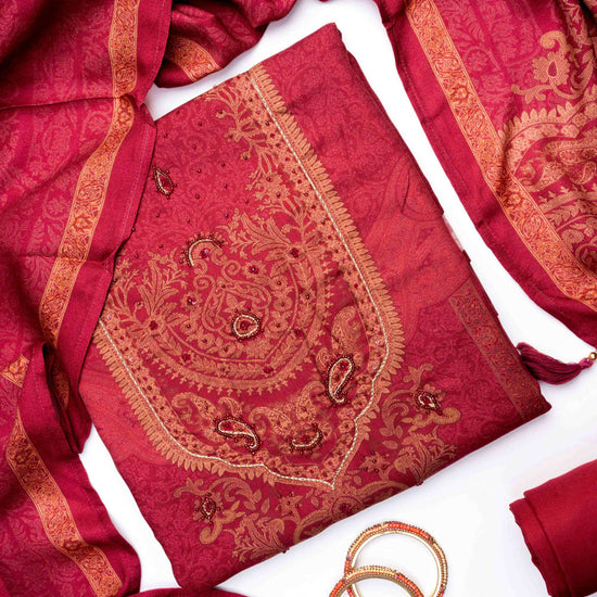 Panna Maroon Pashmina Unstitched Salwar Suit With Pashmina Dupatta